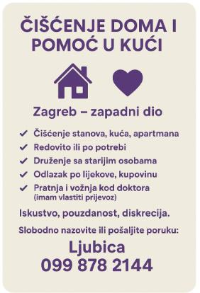 Gospođa pruža usluge čisćenja stanova i kuća, pripomoć, brigu u kućanstvu i uslugu peglanja.