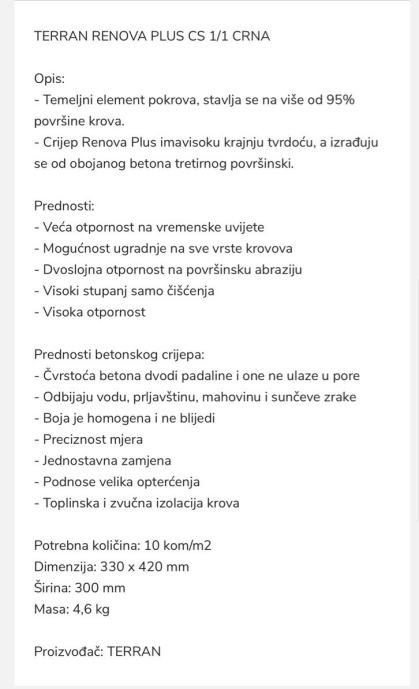 Crijep Renova plus ima visoku krajnju tvrdoću, što se tiče materijala, izrađuju se od obojanog betona, tretiranog površinski.