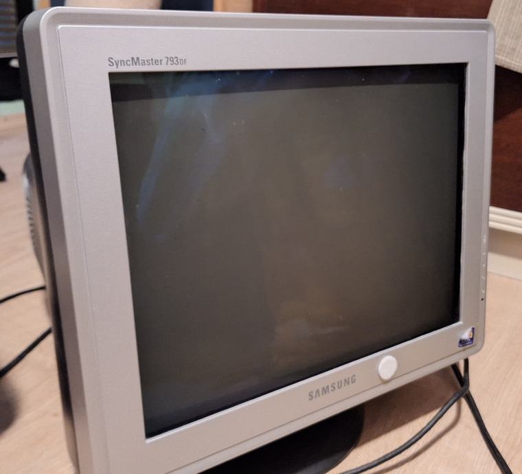 Stariji, korišten i ispravan CRT monitor s naponskim i RGB kabelom. Ponekad malo zuji ali ništa strašno, mislim da je osjetljiv na promjenu vremena :-)