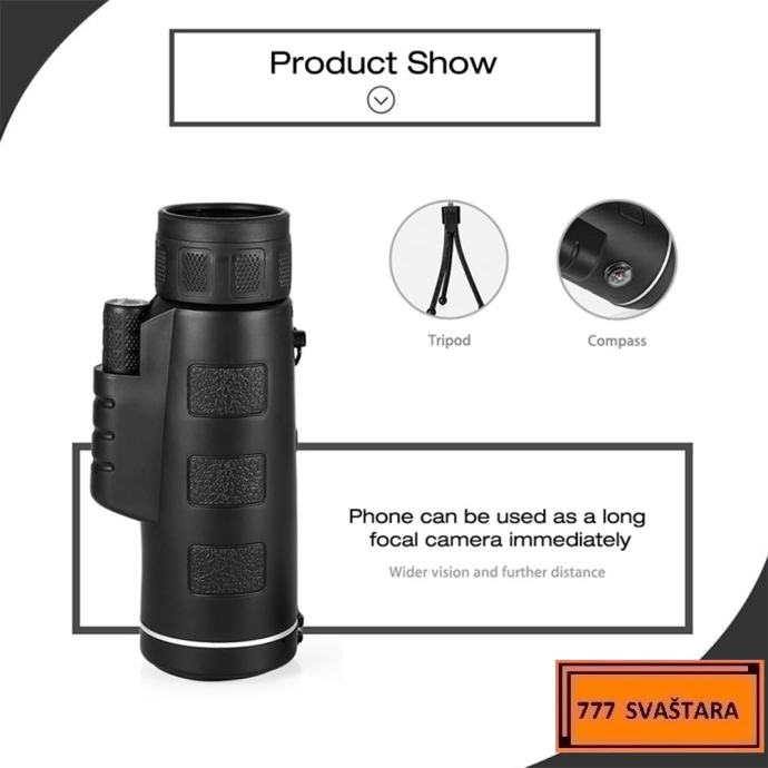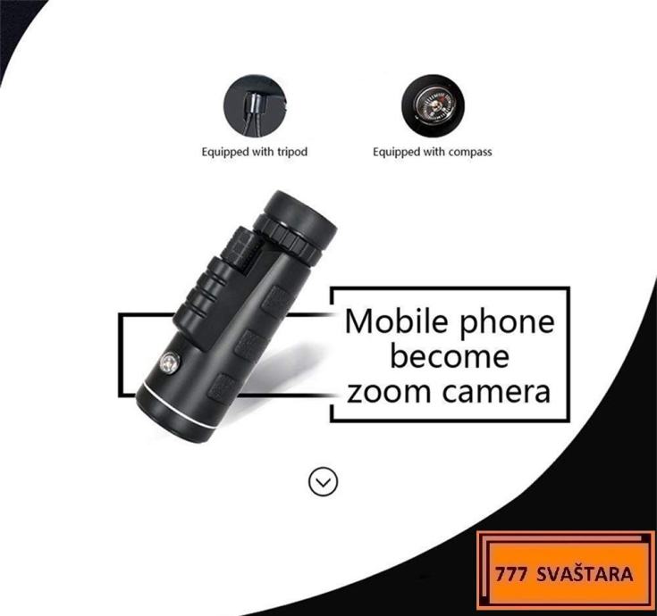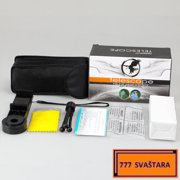 Dobivate: monokular, adapter za držač pametnog telefona, tronožac, priručnik za upotrebu, krpicu za leće i platnenu torbu;
