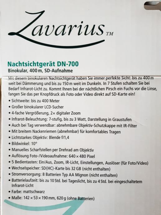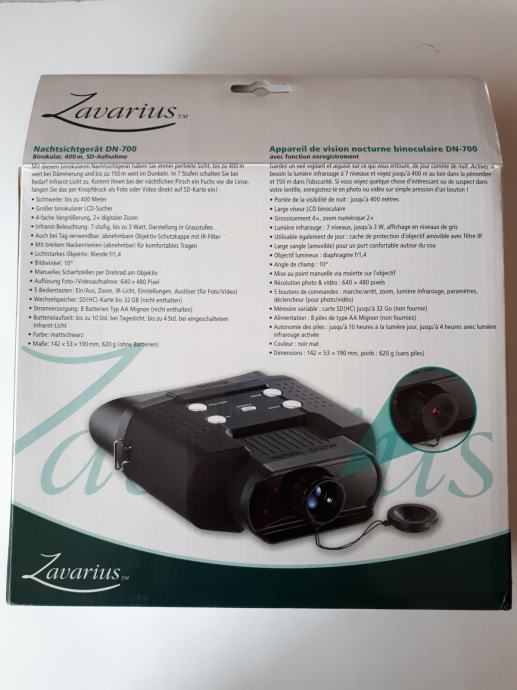 Prodajem noćni digitalni dalekozor Zavarius. Vidljivost u potpunom mraku do 150 m, po danu do 400 m, povećanje dnevno x2 noćni x7 IR osjetljivač, opremljen foto i video zapisom koje se pohranjuje na sd karticu.