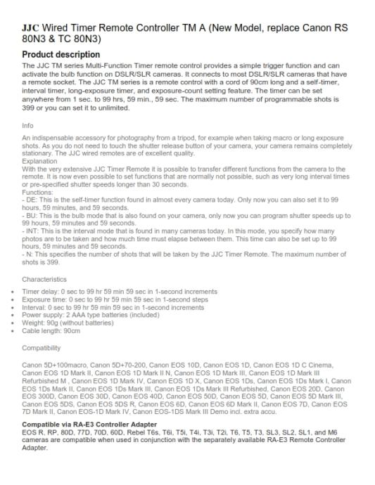 2) Canon cameras timing remote Wire control, maker "JJC"TM-A - New Type (zamjena za Canon RS-80N3 / TC-80N3)- 60 EUR