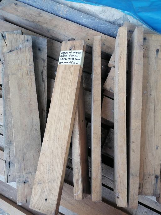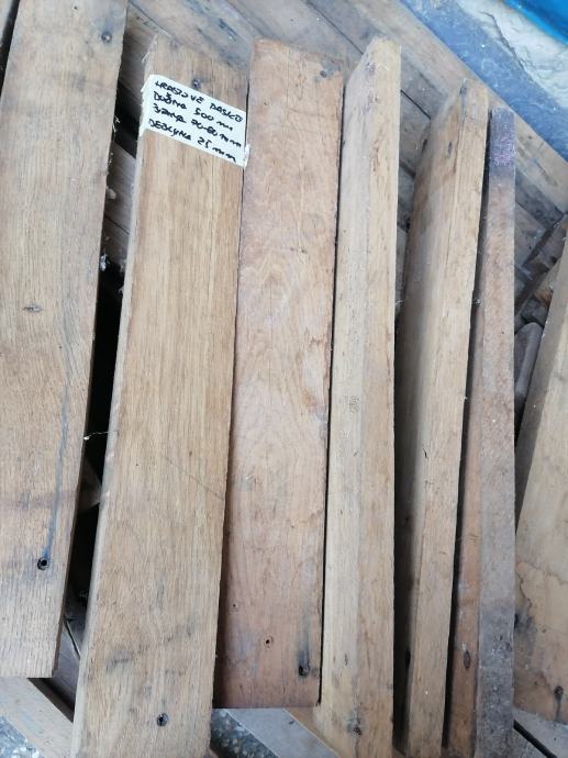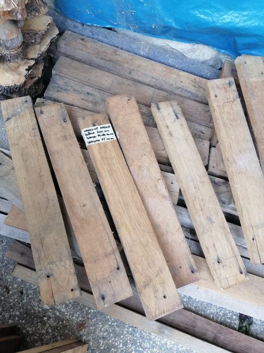 Hrastove daske 500mm dužine. Širine od 70 do 80 mm i debljine 25mm.Trebaju završnu obradu. Vidljive rupe pri krajevima.