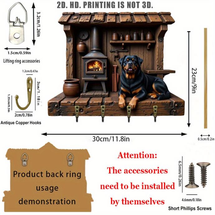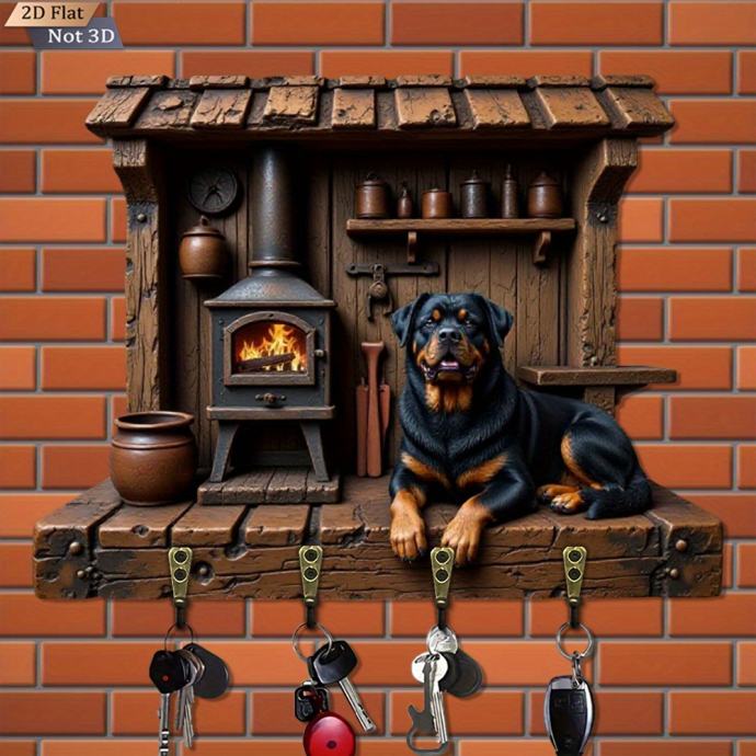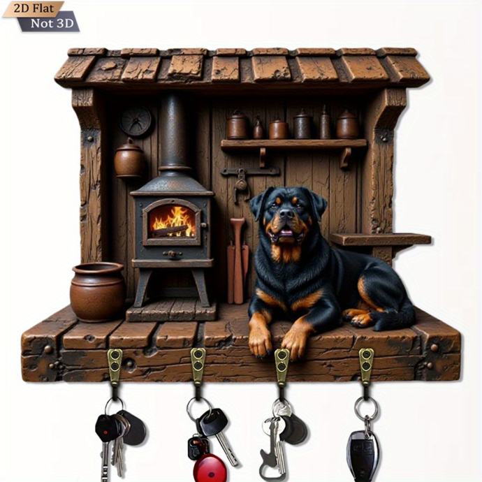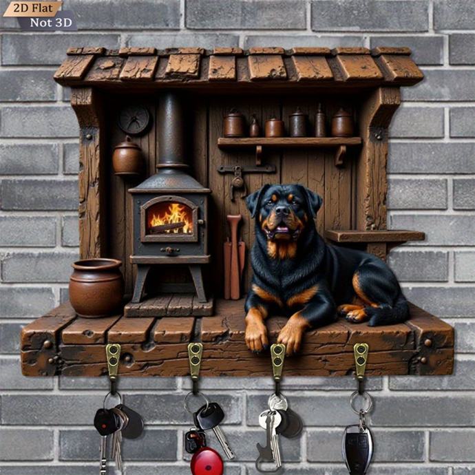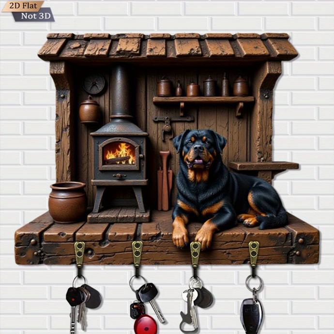 [2D ravnina] 2D ravnina, 1 kom, Kućica za pse rotvajlera u obliku kamina, drveni višenamjenski stalak za ključeve, s četiri metalne kuke, zidni ukras, ukras za trijem, ukras za sobu, ukras za vilu, ukras za dom s četiri godišnja doba (29,97 cm x 22,86 cm)