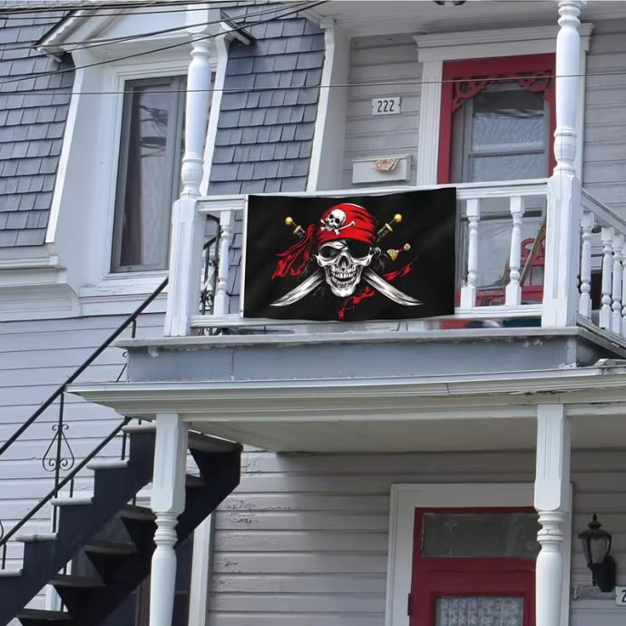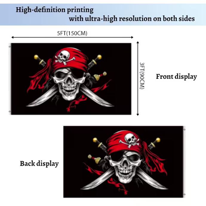 91,44 x 152,4 cm Piratska zastava - Dvostrana Jolly Roger s crvenom bandanom i prekriženim kostima, 100% poliester, ojačani šavovi, 2 mesingane ušice za vanjsku/unutarnju upotrebu