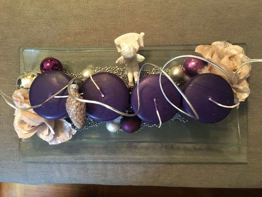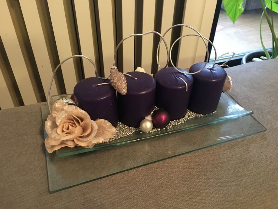 Novo, nekorišteno. Visina svijeće je 7 cm. donje staklo nije fiksno sa gornjim tako da ga po potrebi možete i maknuti. Donje staklo je 33,5 x 17 cm, a gornje 30 x 13 cm.
