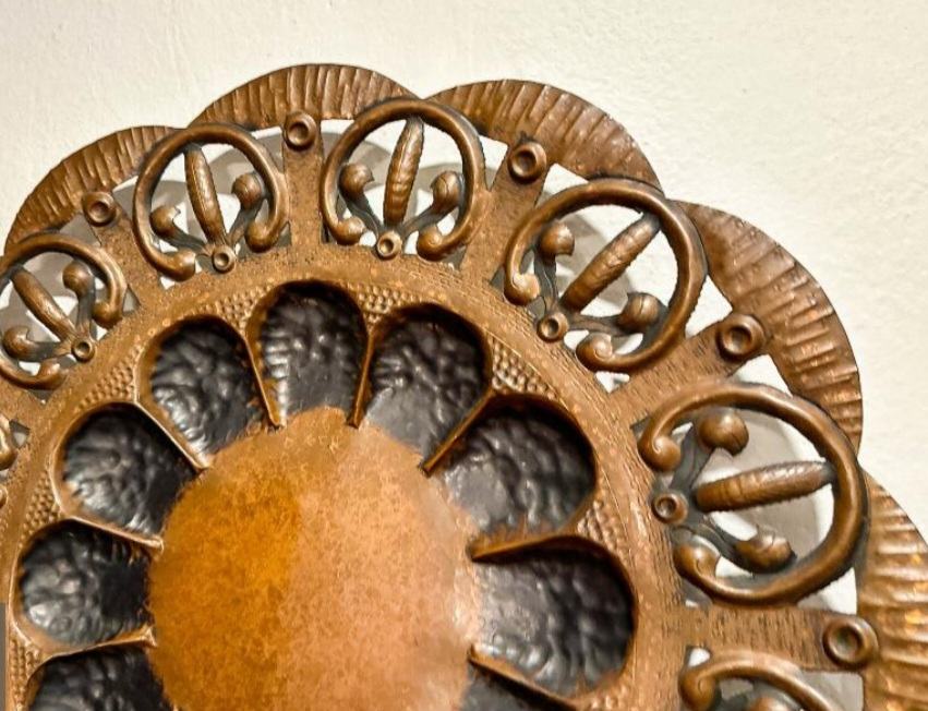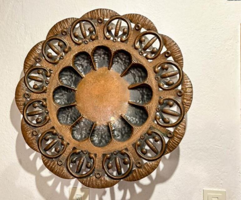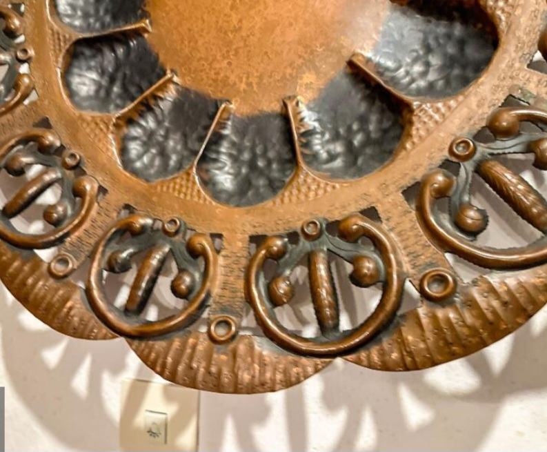 Bakreni zidni tanjur, promjera 62 cm, sjaji na zidu, priča priču staru. Svjetlost se lomi na njegovoj površini, oživljava prostor u toploj tišini.