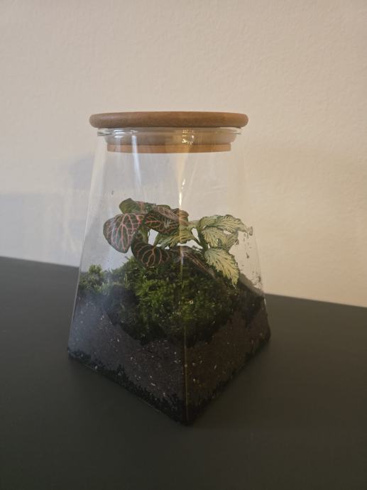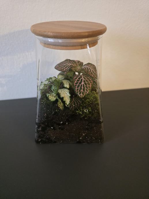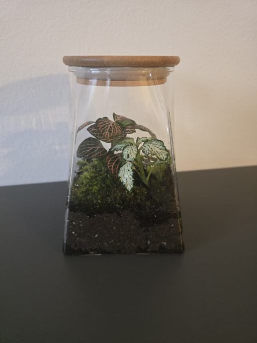 Prodajem nov biljni terarij u staklenoj posudi kvadratnog oblika s bambusovim poklopcem. Unutar terarija nalazi se supstrat, mahovine i ukrasne biljke s karakterističnim šarenim lišćem. Sve je već posloženo i spremno za postavljanje kao dekoracija u prostoru.