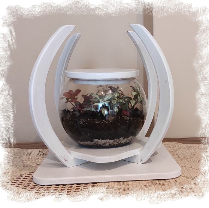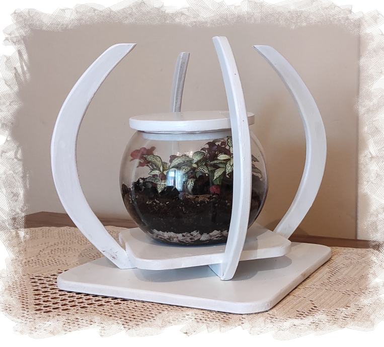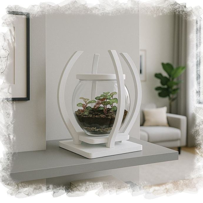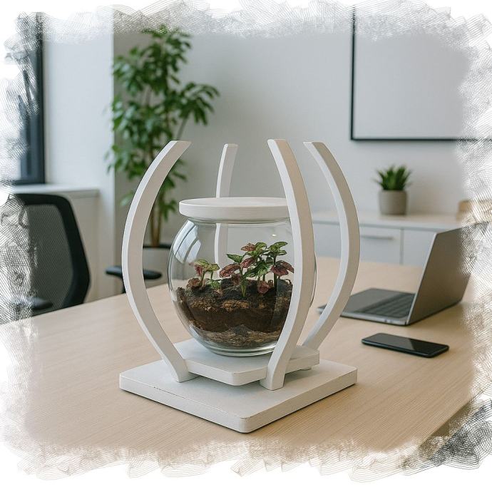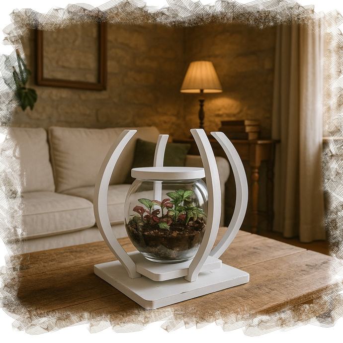Smješten u staklenu kuglu, biljni svijet održava svoju mikroklimu gotovo bez potrebe za intervencijom. No ono što ga izdvaja je elegantno, skulpturalno postolje – izrađeno ručno od punog drva i oslikano s pažnjom prema detaljima.