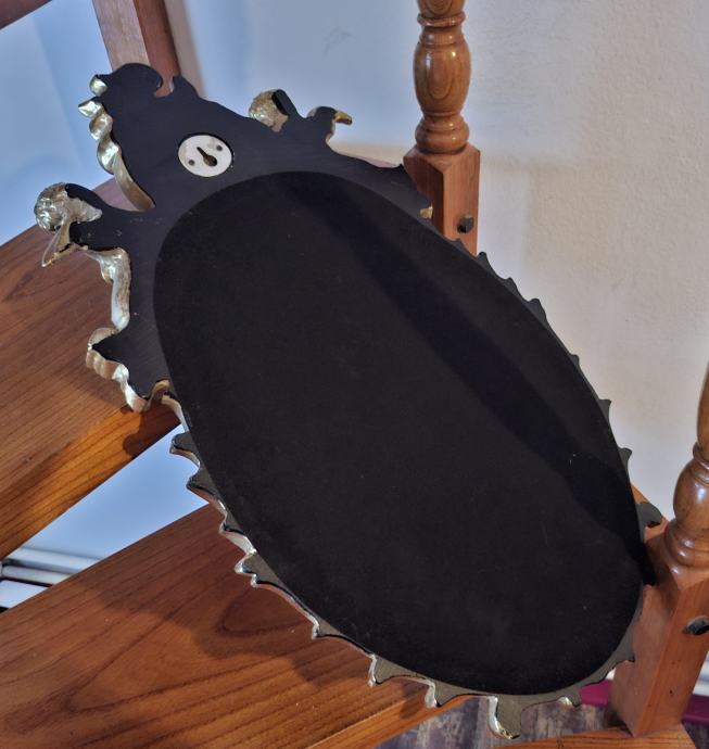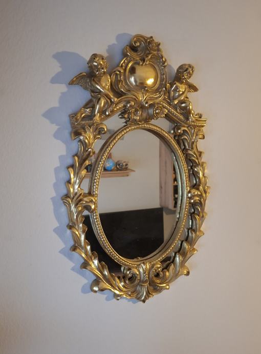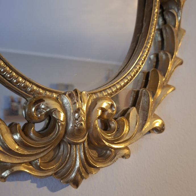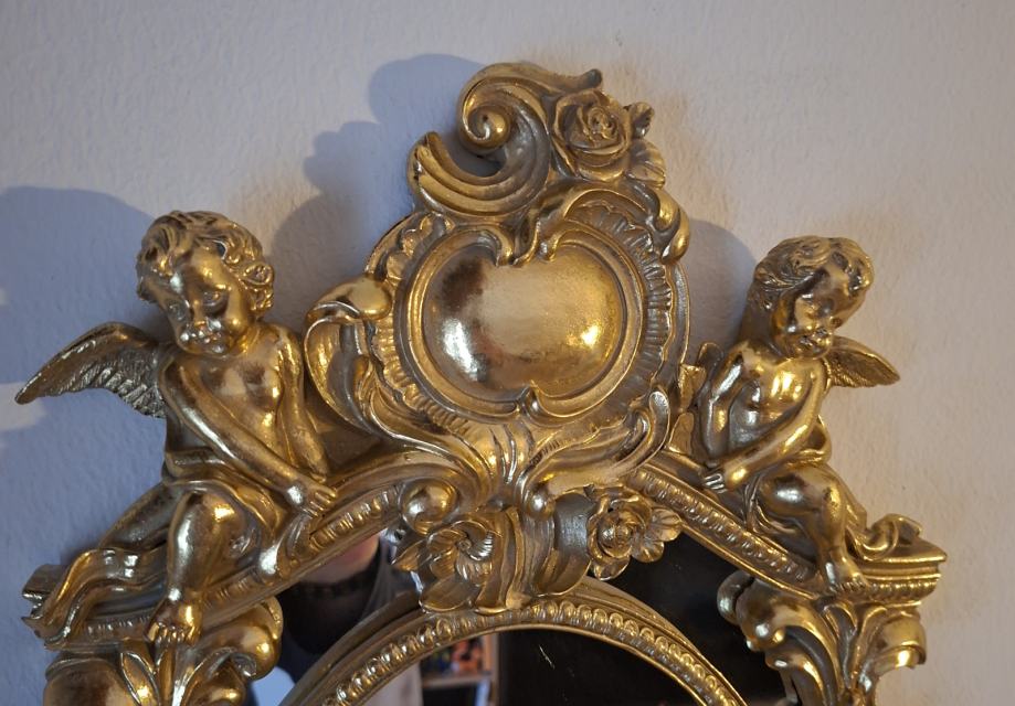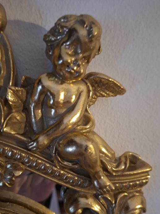 - dekorativno zidno ogledalo s bogato ukrašenim okvirom u baroknom/rokoko stilu, čvrstog okvira, stabilno i u odličnom stanju, srednje veličine (54×35 cm), lako uklopivo u stan, hodnik ili kao dodatak komodi - pravi statement komad koji odmah privlači pažnju, idealno za klasične interijere, ali i kao kontrast u modernom prostoru.