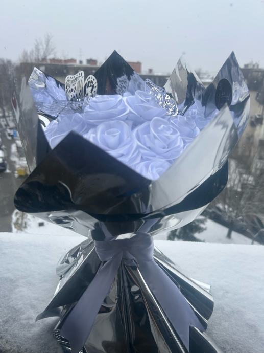 Prodajem ručno rađen buket s bijelim ružama od satena