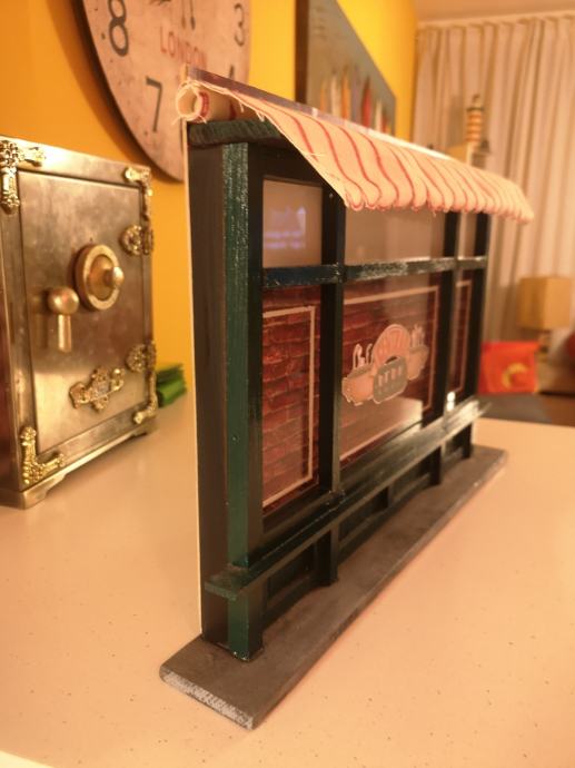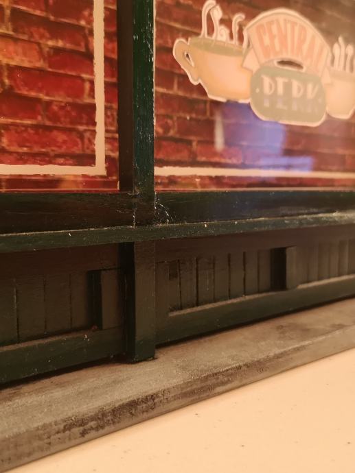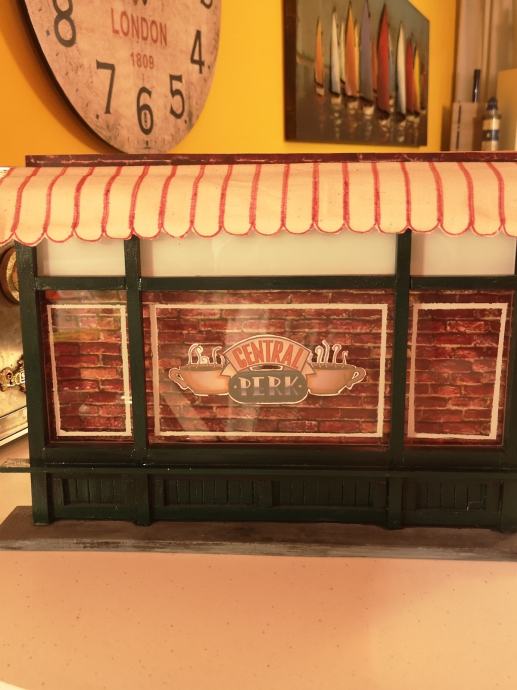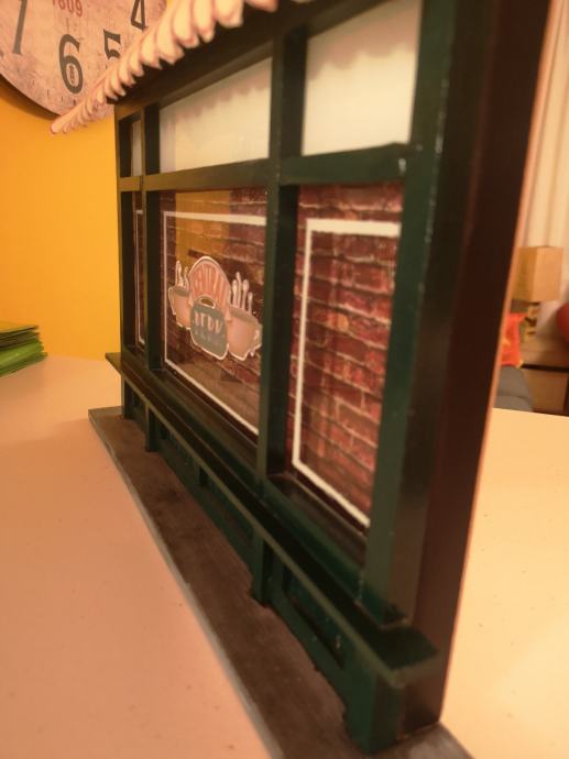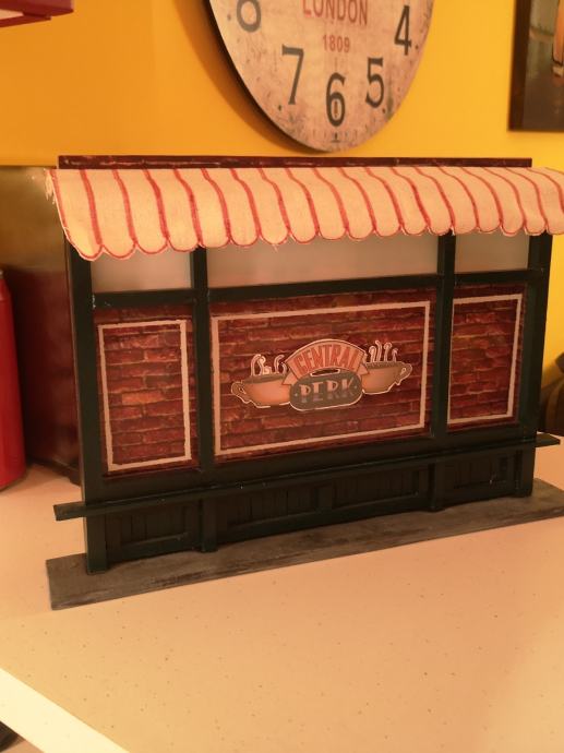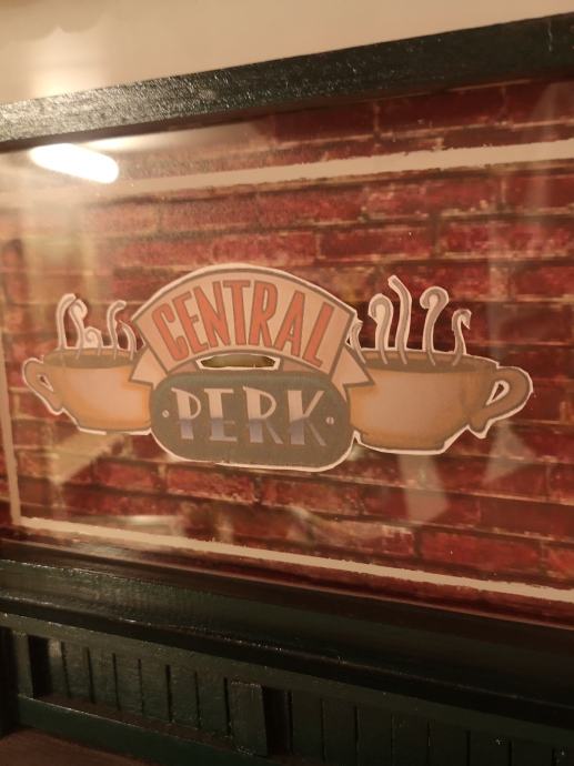 Drvena maketa kafića Central Perk iz serije Prijatelji, Friends. Ručni rad, unikat, pravo staklo, akrilne boje, dimenzije š 43 x v 29 x d 6 cm. Za na zid ili kao samostojeća dekoracija. Ne šaljem pouzećem