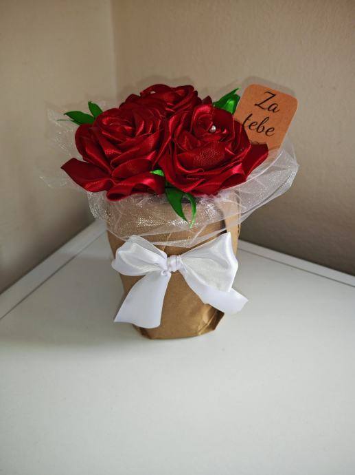 Crveni buket od ručno izrađenih ruža. Buket je umotan u bijelu til mrežicu i ukrašen bijelom satenskom mašnom. Uz buket dolazi i porukica s natpisom "Za tebe".