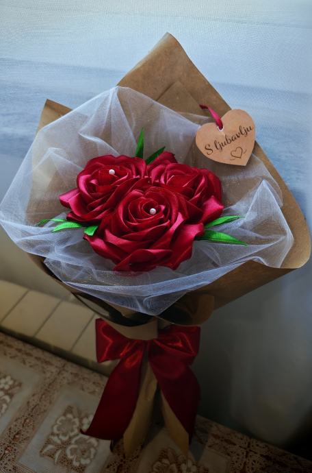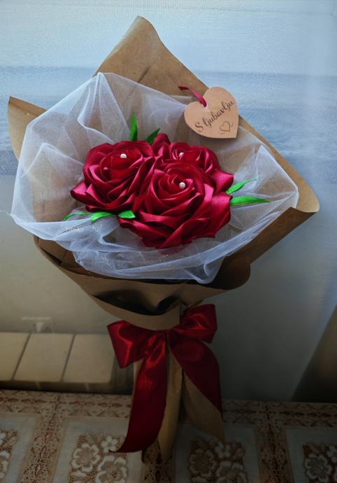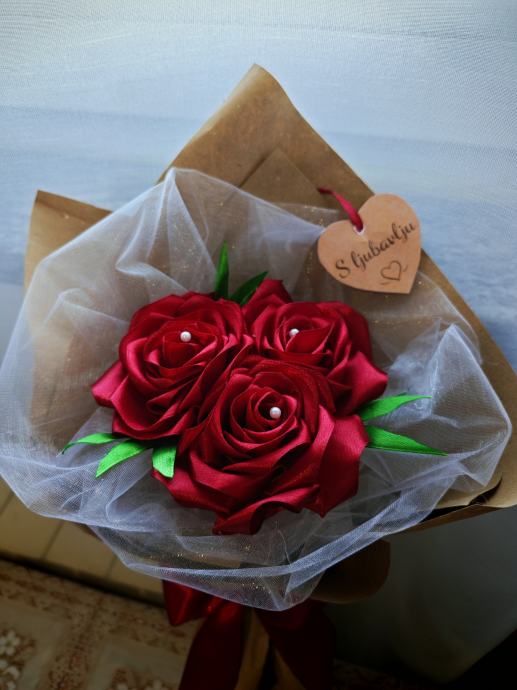 Prodajem ručno rađeni buket od crvenog satena. Buket se sastoji od tri velike ruže izrađene od satenske vrpce u tamnocrvenoj boji, s umjetnim zelenim lišćem i sitnim biserno bijelim detaljima u sredini svake ruže. Umotan je u kraft papir i bijeli til te ukrašen crvenom satenskom mašnom pri dnu. Uz buket dolazi i porukica u obliku srca s natpisom "S ljubavlju".