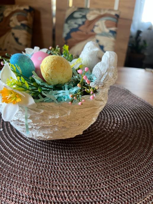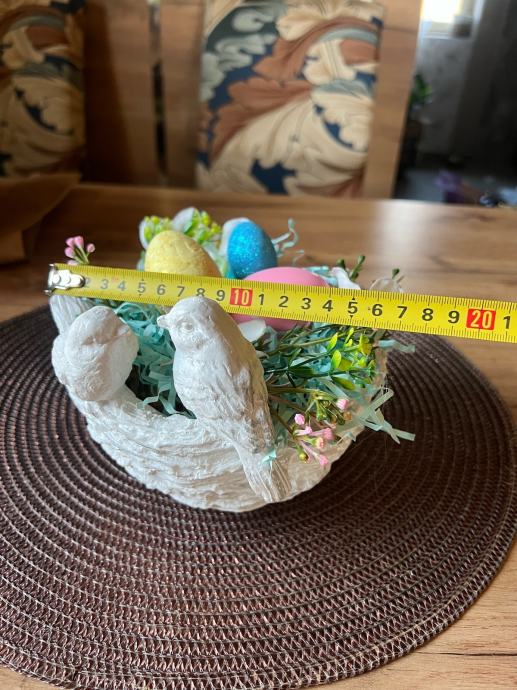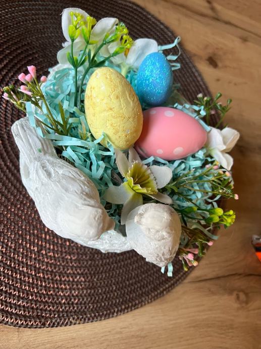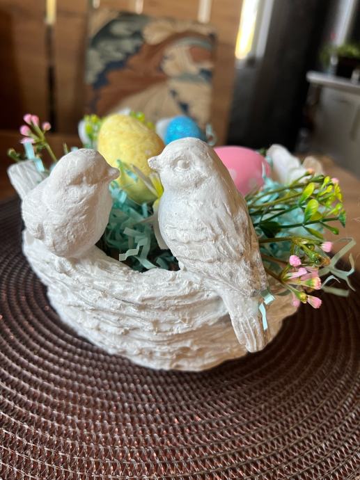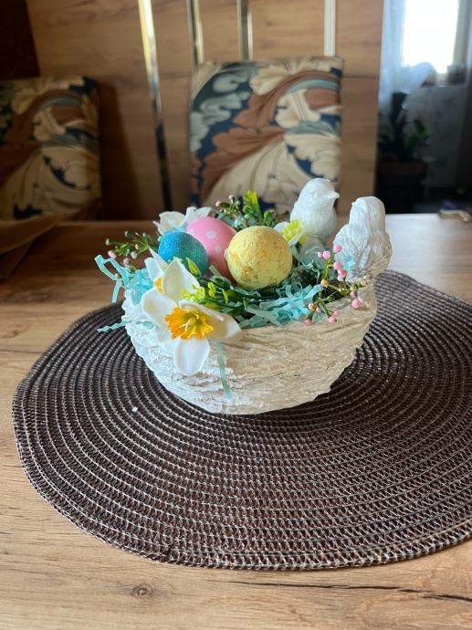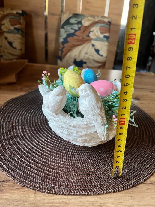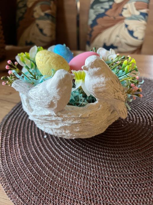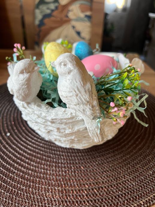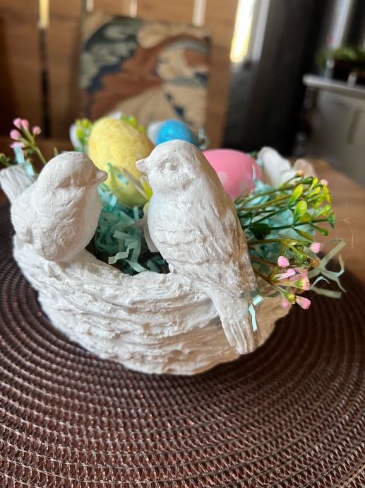 Prodajem novu proljetnu dekoraciju ,gnijezdo s dvije bijele figurice ptica. Gnijezdo je ispunjeno šarenim jajima u plavoj, žutoj, ružičastoj i boji te umjetnim narcisima i cvjetićima .
