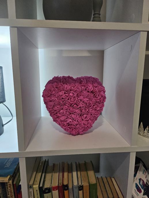 Prodajem prekrasnu dekoraciju u obliku srca prekrivenu ružicama. Dimenzije su 23x21 cm, što je idealna veličina za police, komode ili kao zidni ukras. Srce je u boji fuksije i čini lijepu dekorativnu notu u bilo kojem prostoru. Kompletno novo. Ručno rađeno.