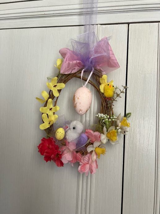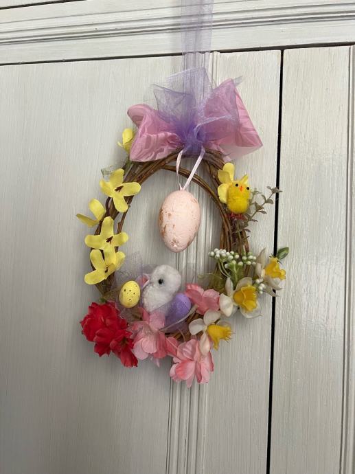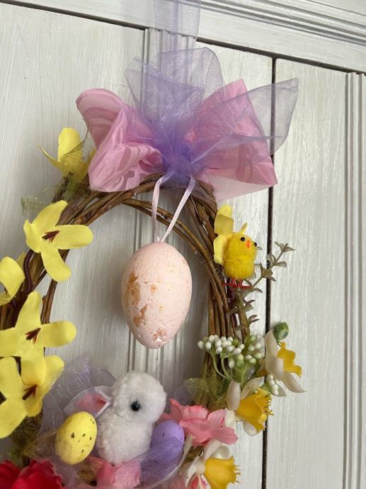 Prodajem novu uskrsnu dekoraciju u obliku vijenca od prirodnih grančica. Vijenac je ukrašen umjetnim cvijećem u raznim bojama, uskrsnim jajima i ukrasnom mašnicom od tila u ljubičasto-ružičastoj boji. Promjer vijenca iznosi otprilike 20 cm. Lijepo izgleda obješen na vrata ili u prostoru kao sezonski ukras.