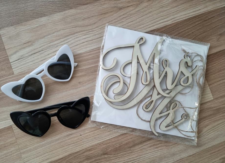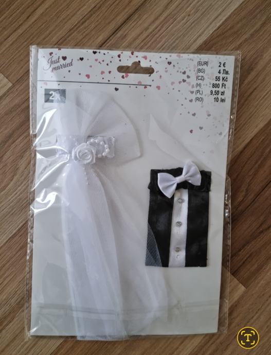 U setu se dobije 20 bijelih mašni, 12 komada tila (dimenzije 170x80), ukras za čaše, dvije vrste cvijeća, til u roli, naočale, ukras na konopcu mrs/mr, držač balona.