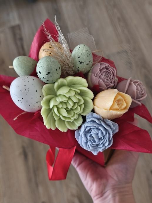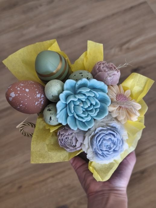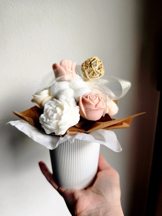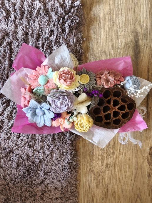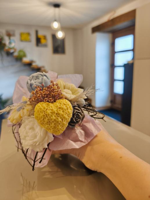 Dekoracije od voska u obliku cvjetnih buketa za sve prigode. Buket se sastoji od sojinih cvjetova različitih oblika boja i mirisa te prigodnih dodataka, sve lijepo složeno u ukrasnoj kutijici ili vrečici. Radi se o ručno rađenim dekoracijama koje izgledaju vrlo efektno kao kućni ukras. Prigodno za obljetnice, rođendane, krštenja i sl. Dugotrajna usponena.Javite se oko dogovora za izradu i dostavu na području Istre.