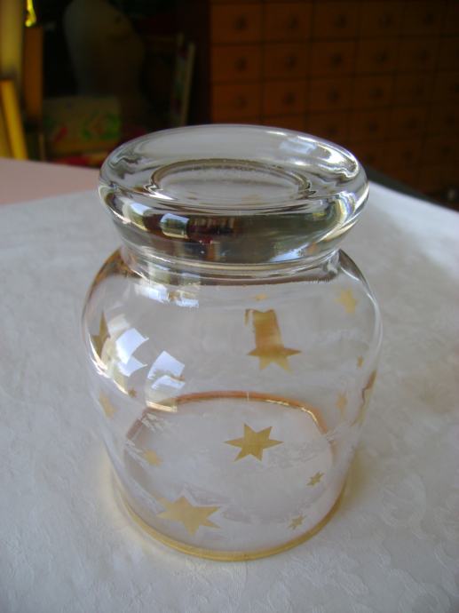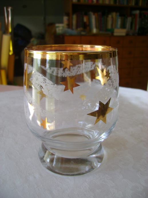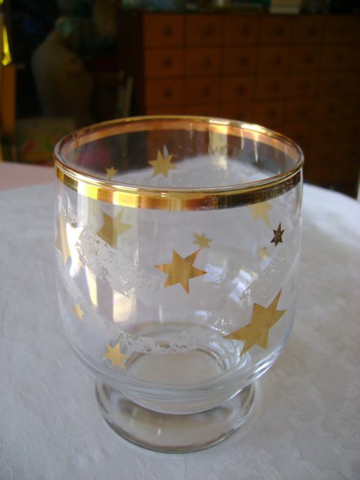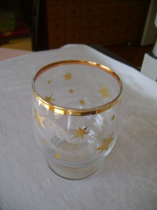 Dekorativna čaša sa zlatnim zvijezdama, visina cca 12 cm, promjer gore 8,5 cm, može biti i čaša za lučice, korištena, bez oštećenja - stanje je vidljivo na slikama.
