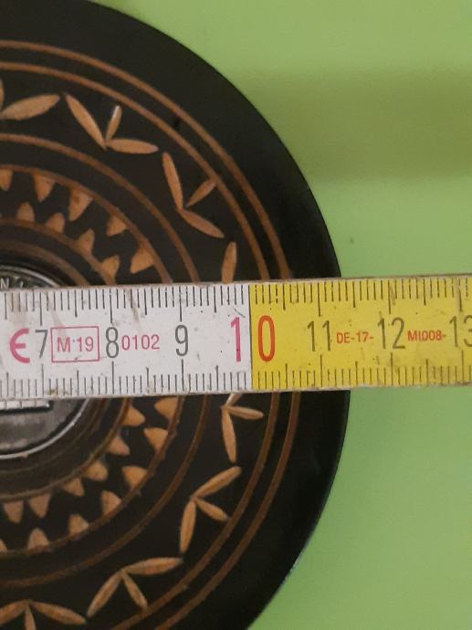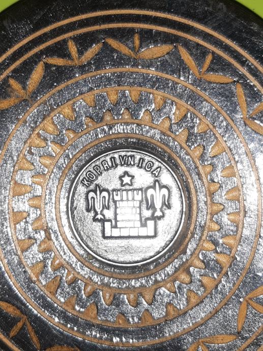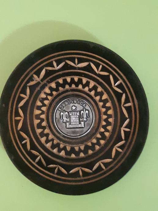 Rezbareni drveni s metalnim grbom grada Koprivnice u sredini.stanje dobro,promjer 11 cm.šaljem poštom i tiskom.0958241802