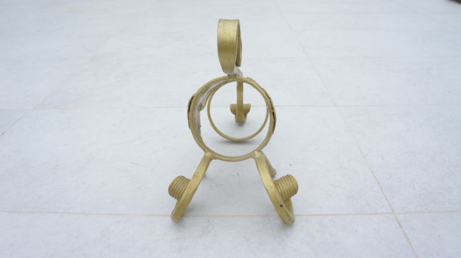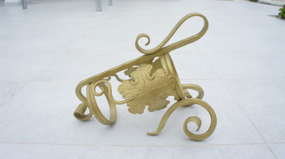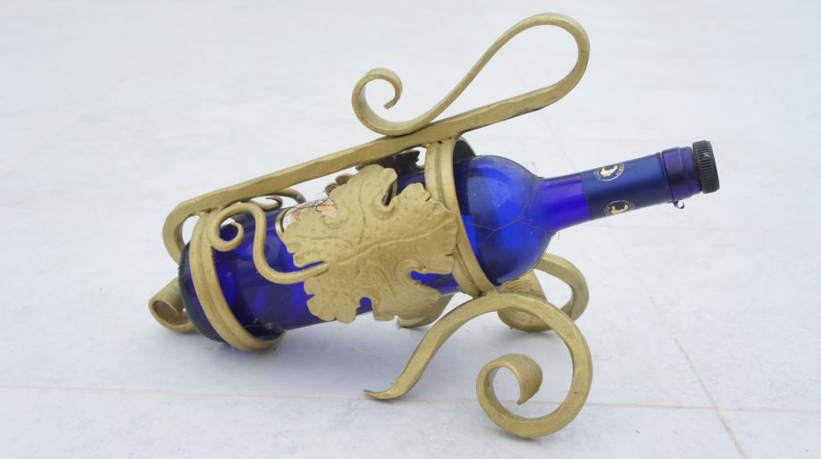 Ukrasni drzac za bocu od kovanog zeljeza zlatne boje, kvalitetan, jako dekorativan.