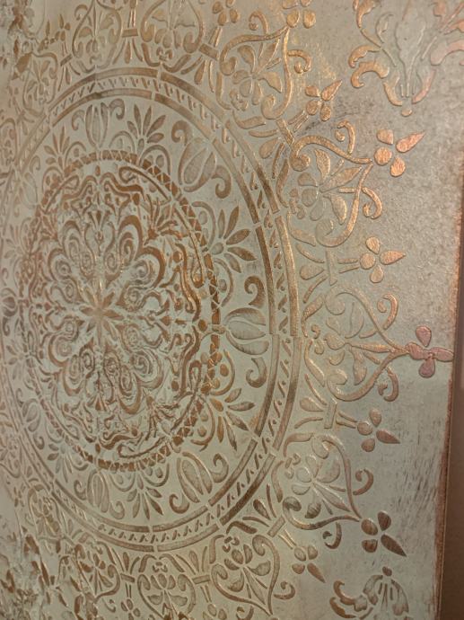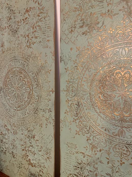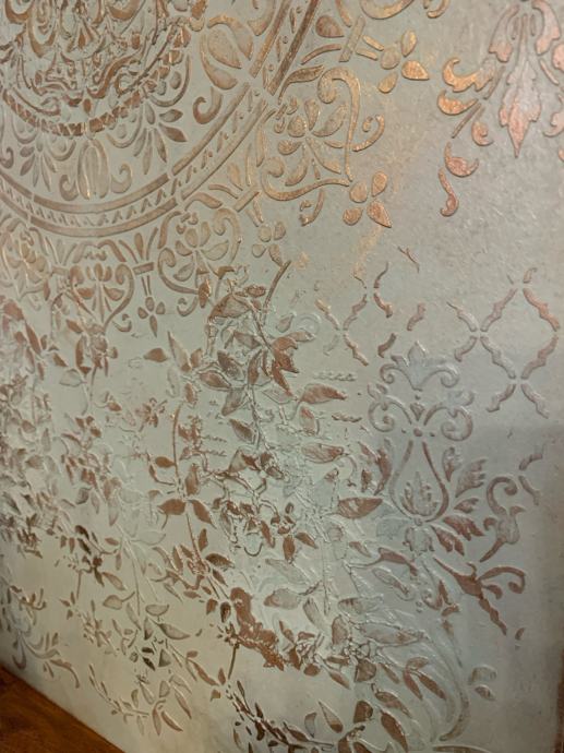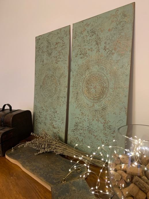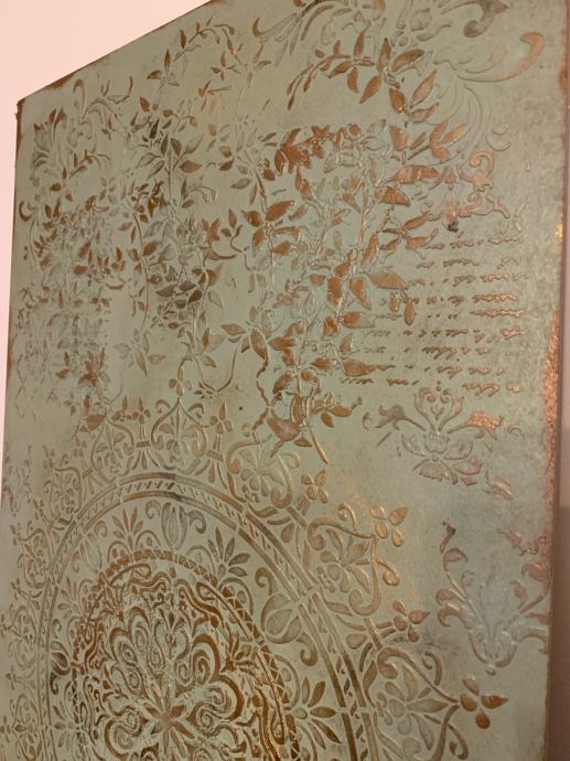 Reljefna pasta, Pastelna zelenoplava sa broncanim acrylom na drvenoj ploci. Ca. 80x40 cm, ploca 3 mm. Rucni rad