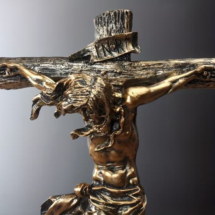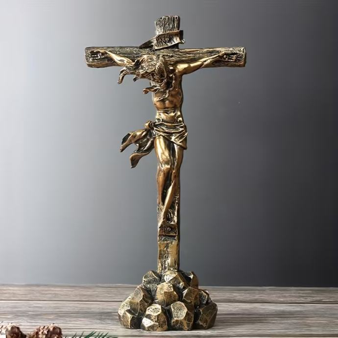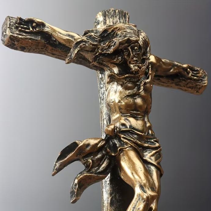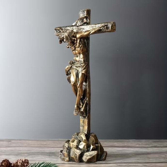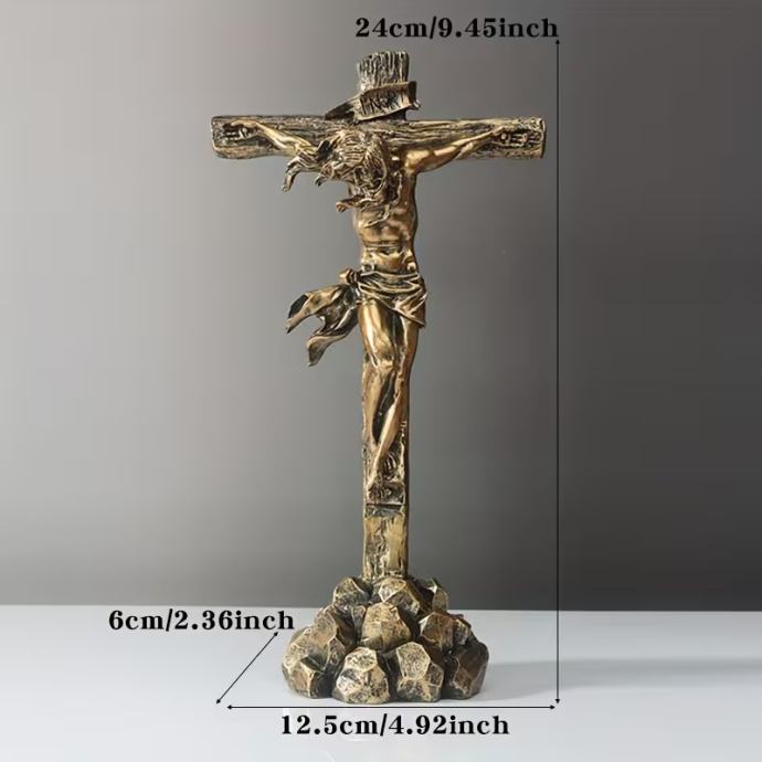 Elegantni crno-zlatni kip Krista s križem - religiozna figurica od smole s zamršenim dizajnom, savršena za Božić, Uskrs, Dan zahvalnosti