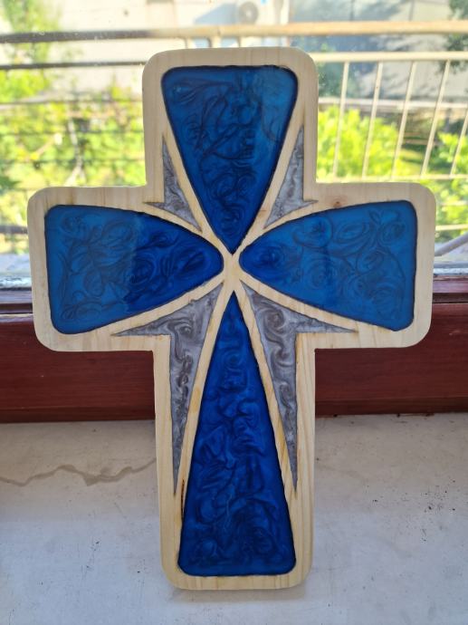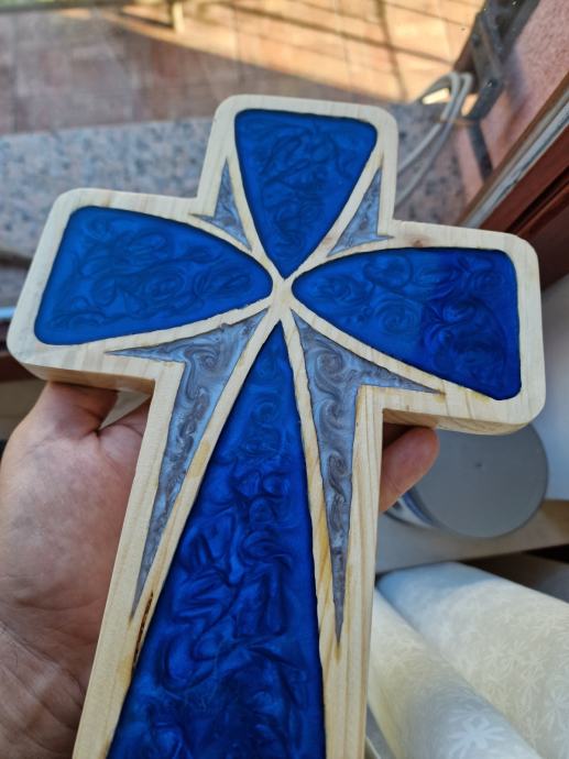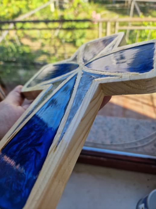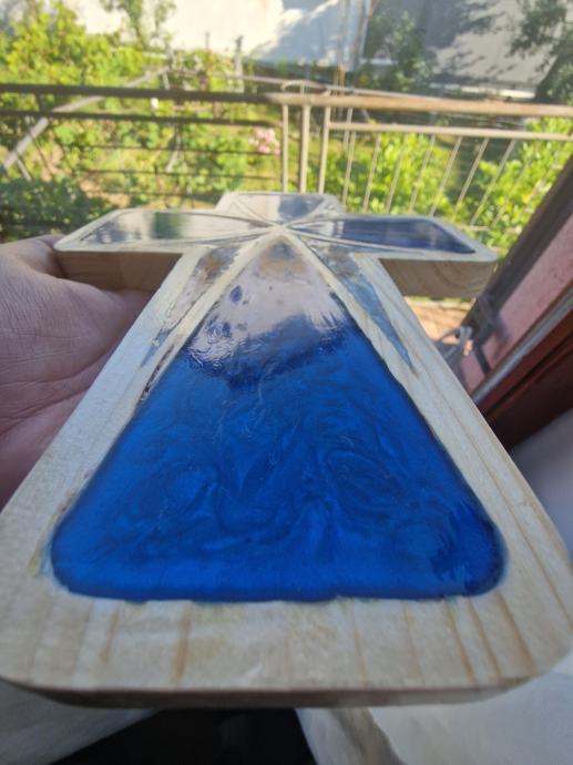 Izrezbareno drvo ispunjeno epoxy smolom pa polakirano.