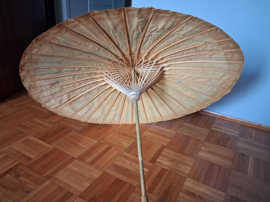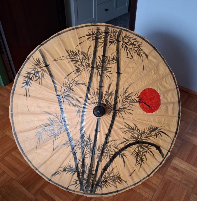Ručno izrađen i oslikan kišobran/suncobran od uljanog papira. Promjera 84cm. U super stanju.