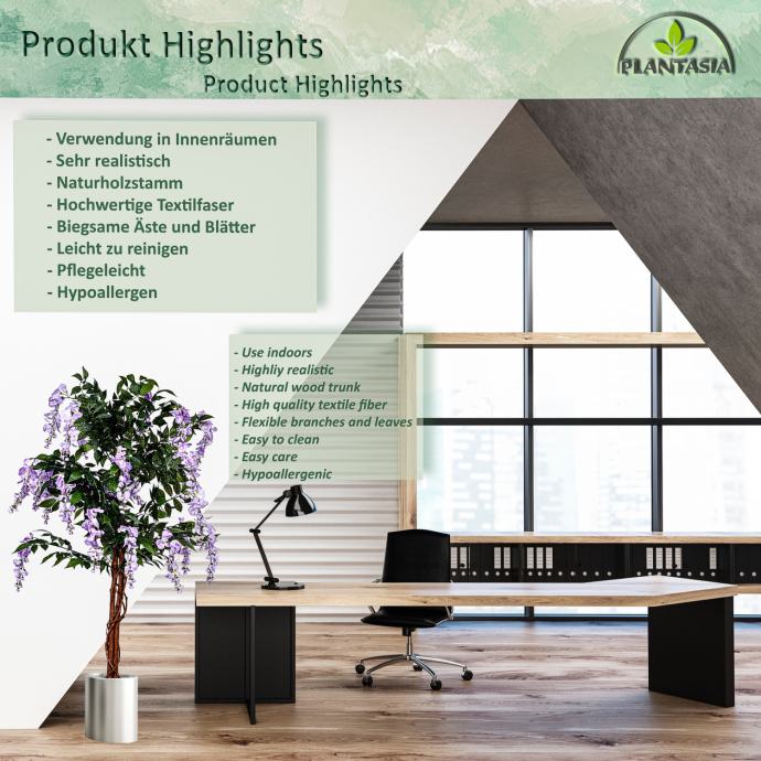Umjetna glicinija iz PLANTASIJE ima autentično ukorijenjeno pravo drveno deblo od palminog drveta, a stablo glicinije također ima 756 listova i 24 cvjetne vitice. Stabilna cementna bazna posuda promjera 18 x H 17 cm pruža siguran oslonac za umjetnu biljku.