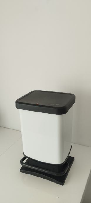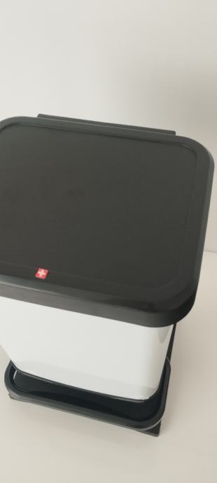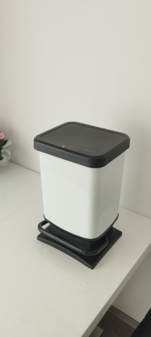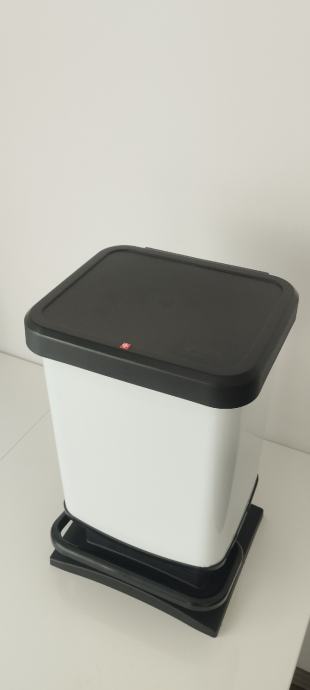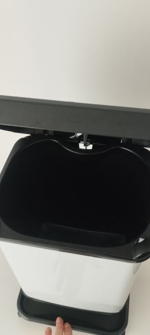 Kvalitetan koš za otpad s nožnom papučicom. Kroz veliki otvor je moguće lagano punjenje kante i vađenje vrećice za smeće. Pravokutni oblik omogućava optimalno korištenje prostora. Izrađen je u kombinaciji bijele i crne boje. Velika papučica omogućava udobno otvaranje. Zapremina 20 l.Ublaživač zatvaranja.