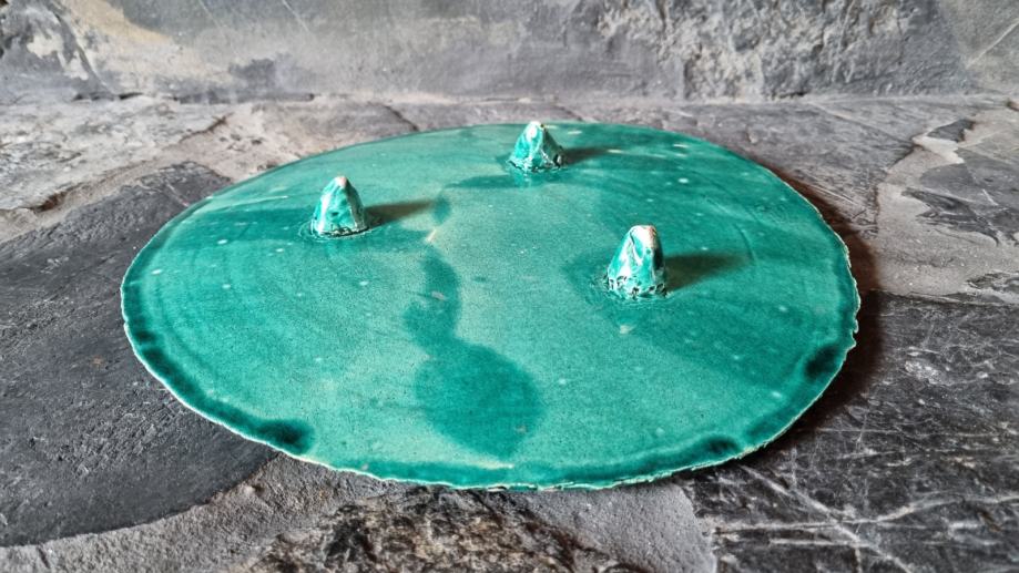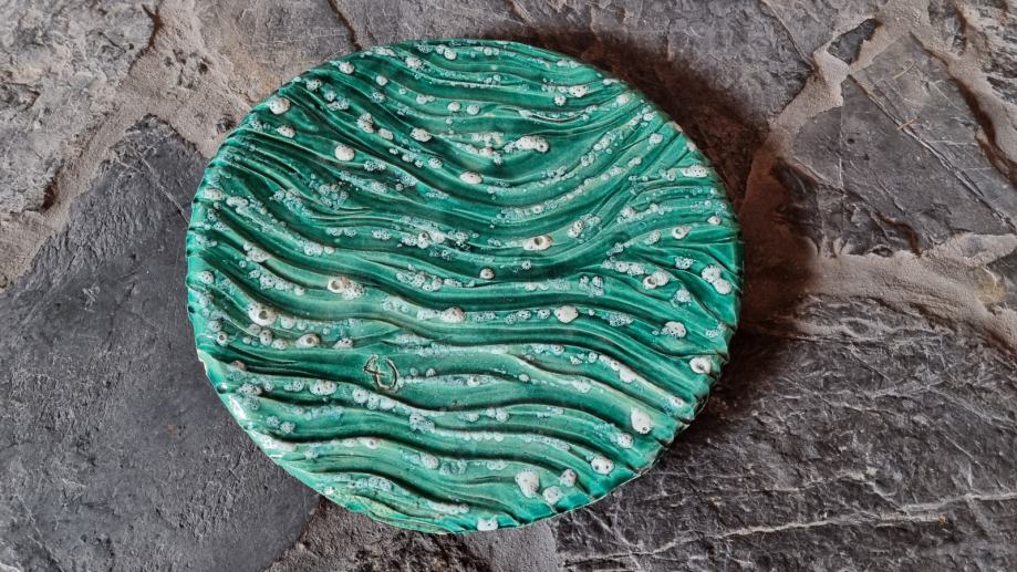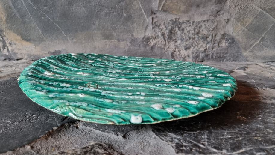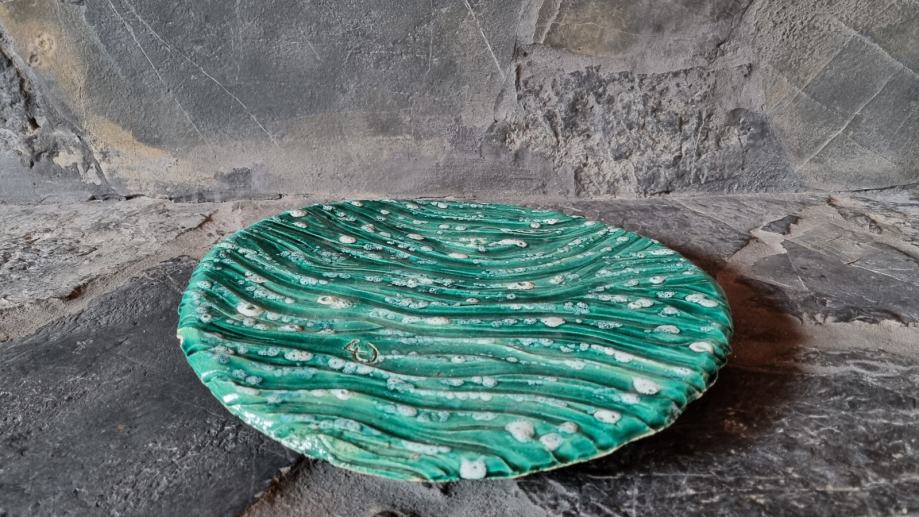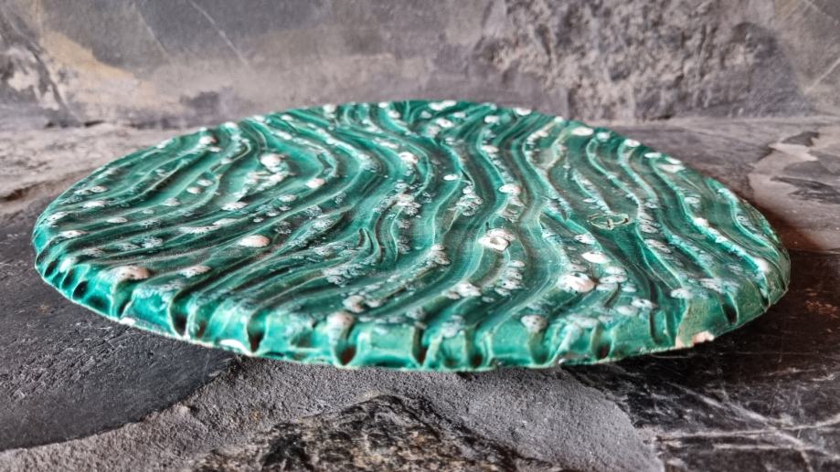Dekorativni tanjur za voće izrađen od keramike s engobama, glaziran.