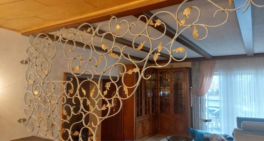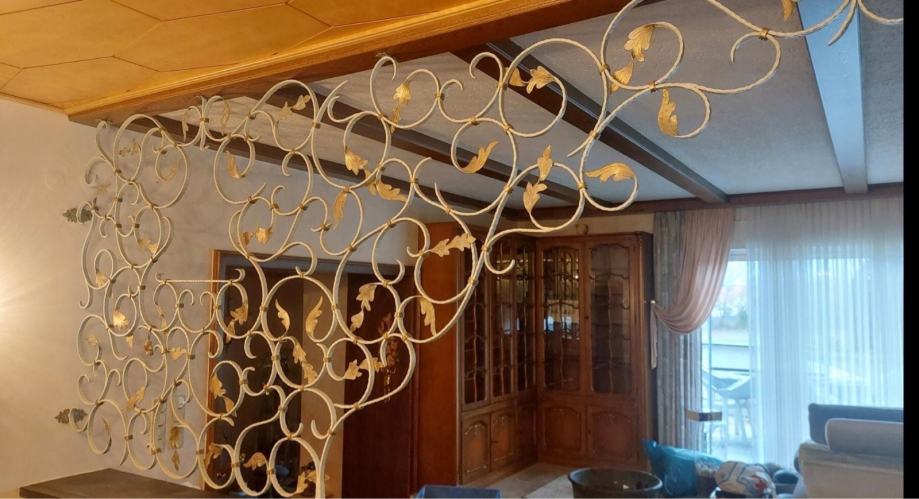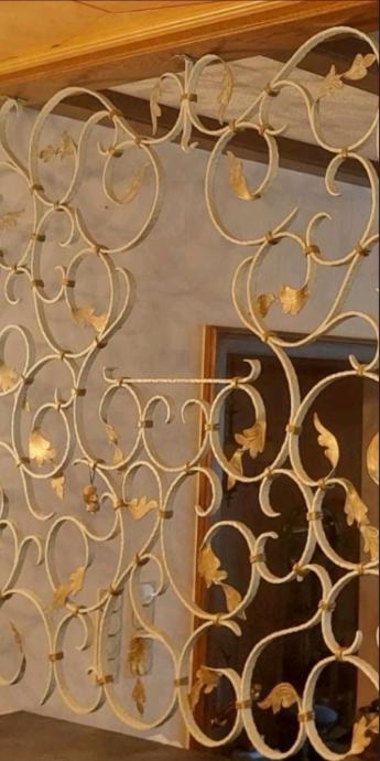 Prodajem ručnu kovačku ukrasnu pregradu izrađenu od kovanog željeza s dekorativnim zlatnim listovima. Elegantnog je i klasičnog dizajna, idealna za odvajanje prostora u dnevnom boravku, blagovaonici ili hodniku. Može poslužiti i kao stilizirani dekorativni element u restoranima, hotelima, salonima ili rustikalnim interijerima.