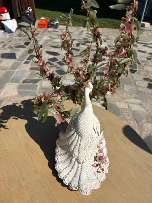 Prodajem kristalnu cvjetnu figuru, lijepu dekorativnu kompoziciju koja se sastoji od grančica s cvjetovima i listićima izrađenih od kristala u nježnim ružičastim i zelenim tonovima, postavljenih u bijelu porculansku posudu. Uz posudu dolazi i ukrasna figura bijelog pauna s detaljno izrađenim perjem. Sve zajedno čini elegantnu dekoraciju koja lijepo osvježava svaki prostor.