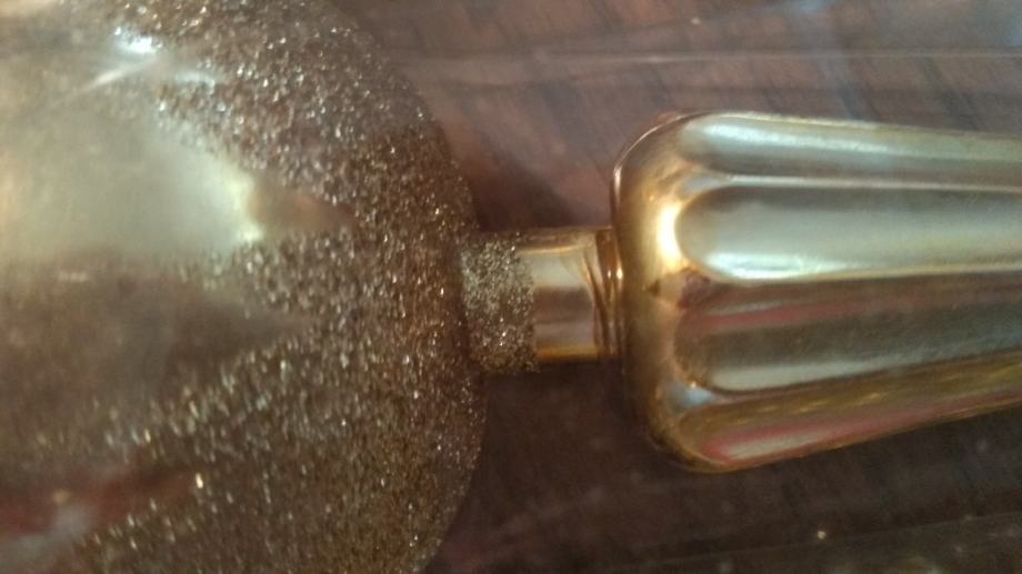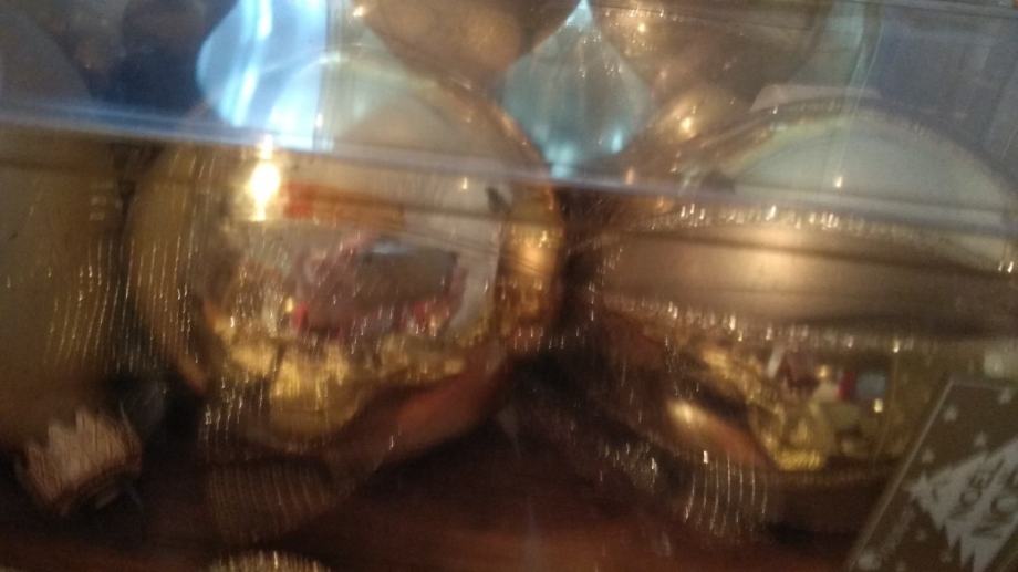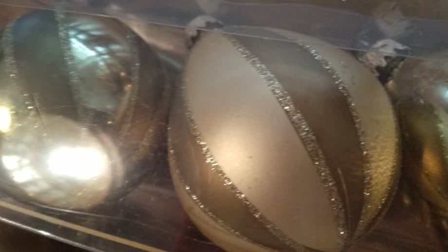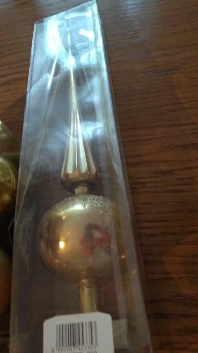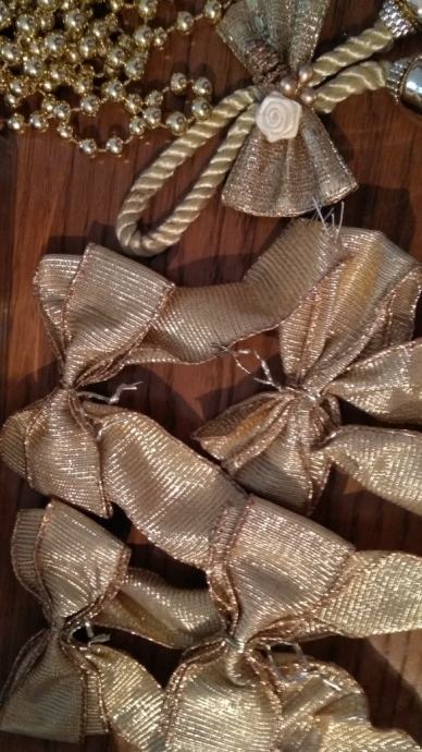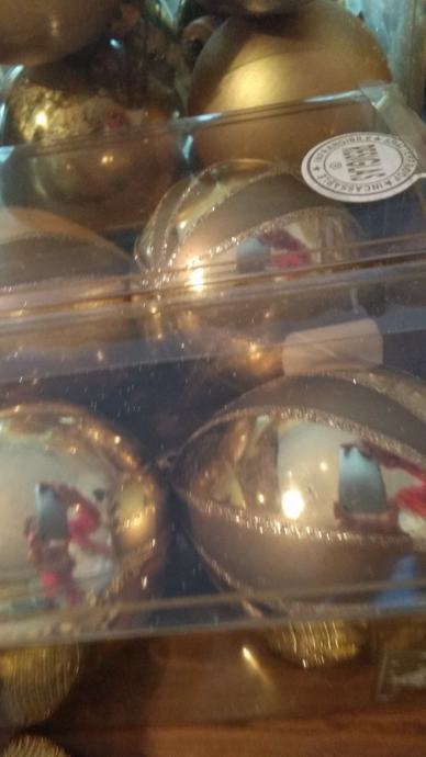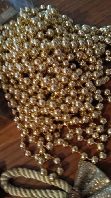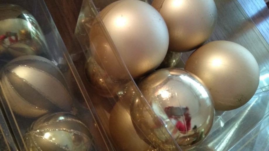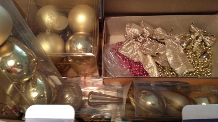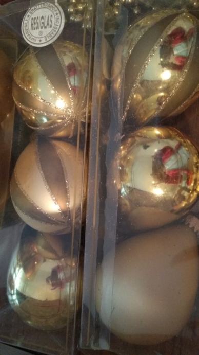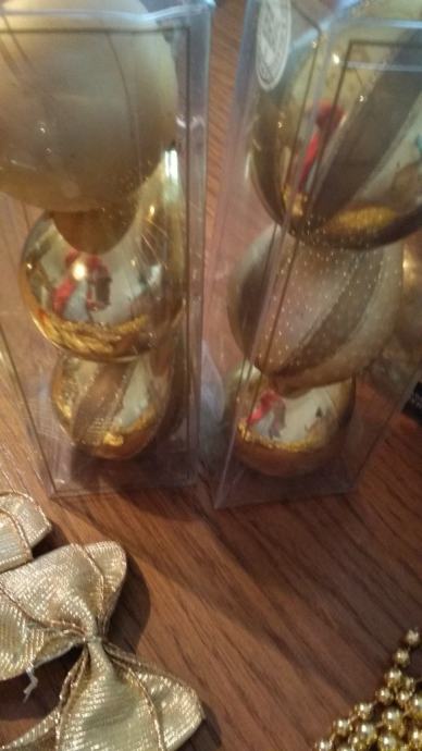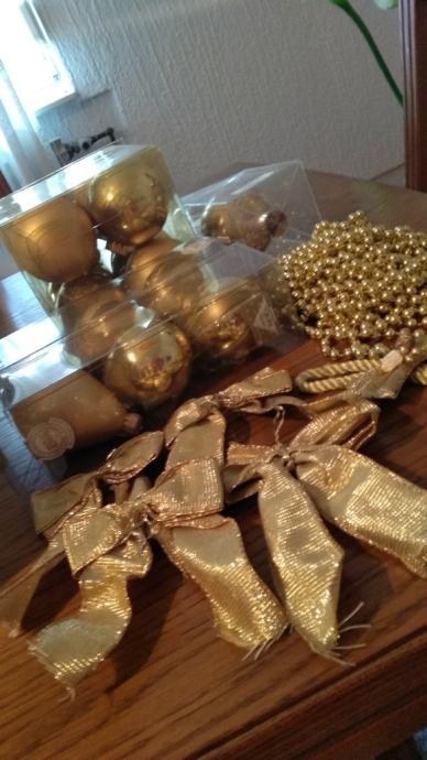 Sve na slici: 4 velike kugle, 6 srednjih velikih kugli, 5 mašni, vrh za bor, grilanda lanac zlatnih perli