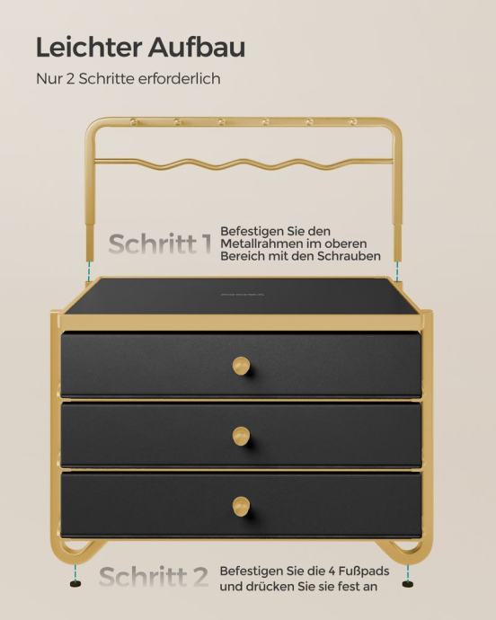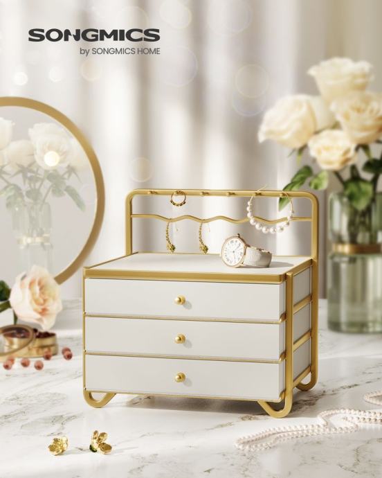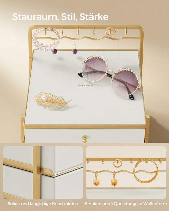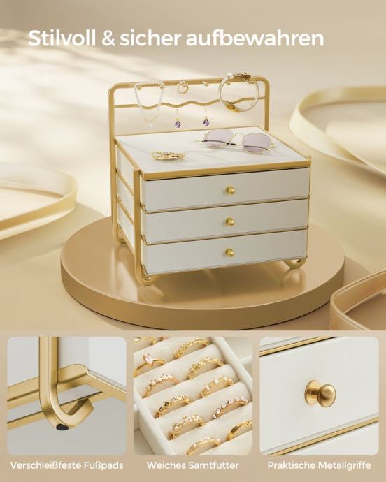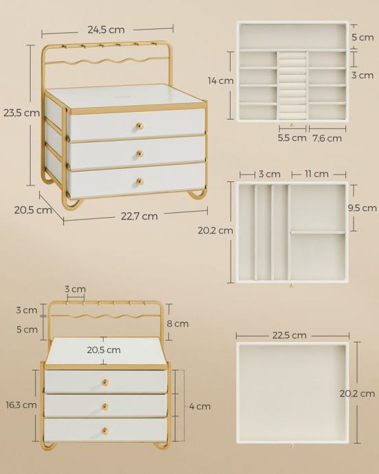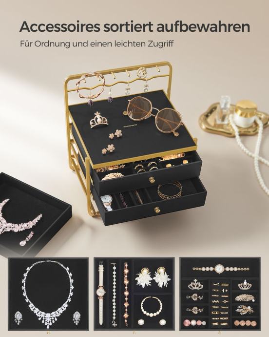 Mješavina zlatnog okvira i crne kutije s tintom s PU premazom definira ovu jedinstvenu, elegantnu kutiju za nakit. Služi kao istaknuti komad koji uljepšava svaki dekor. Ova kutija za nakit ima 3 velike ladice, od kojih svaka nudi različite pretince za prstenje, narukvice, broševe, naočale, pa čak i satove. Neka vaše vrijedne stvari budu organizirane i lako dostupne. Potrebna su samo 2 koraka: jednostavno umetnite šipke u gornji dio i čvrsto ih pričvrstite, zatim pričvrstite 4 jastučića za noge i ostavite ih da miruju - kutija je spremna za izlaganje vaših vrijednih komada! Gornja strana: 6 kukica i prečka u obliku vala - idealan prostor za narukvice, naušnice itd. Često korišteni predmeti ili veći dodaci kao što su sunčane naočale mogu se pohraniti na dohvat ruke u gornjem dijelu. Ova kutija za nakit prekrasan je, poseban poklon za vaše prijatelje i voljene, kao i savršeno iznenađenje za rođendane, godišnjice i druge praznike. Naravno, možete ga koristiti i kao poklon za sebe! Za sve informacije nazovite na broj telefona 092/399-75-19