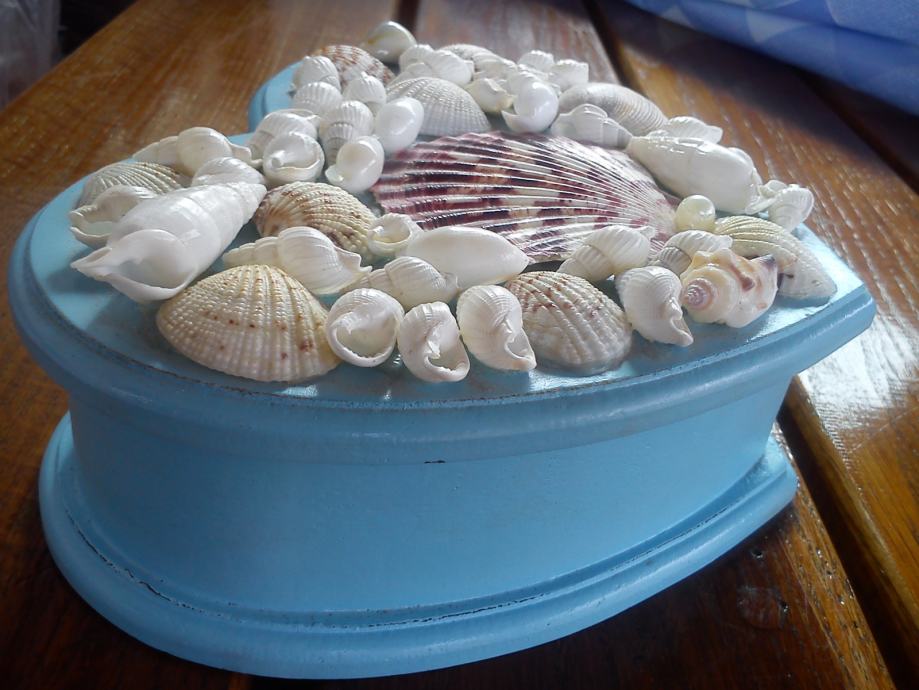 Kutija je napravljena od drveta, metalnih šarkica, školjkica i biserčića