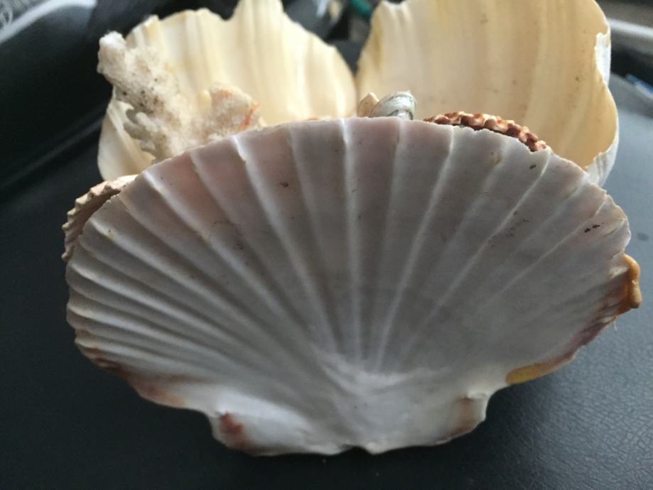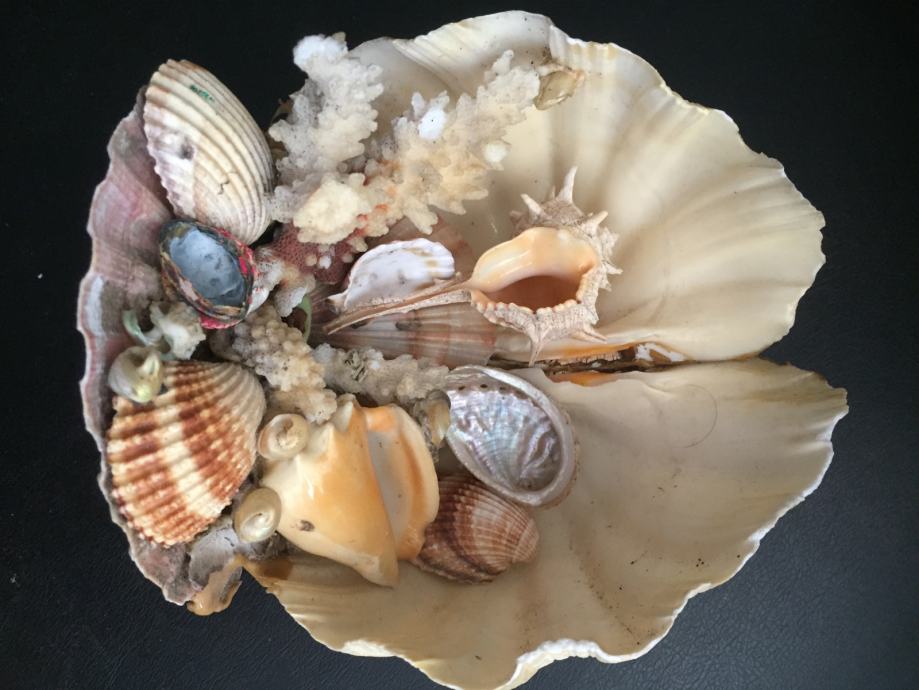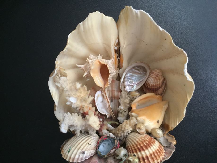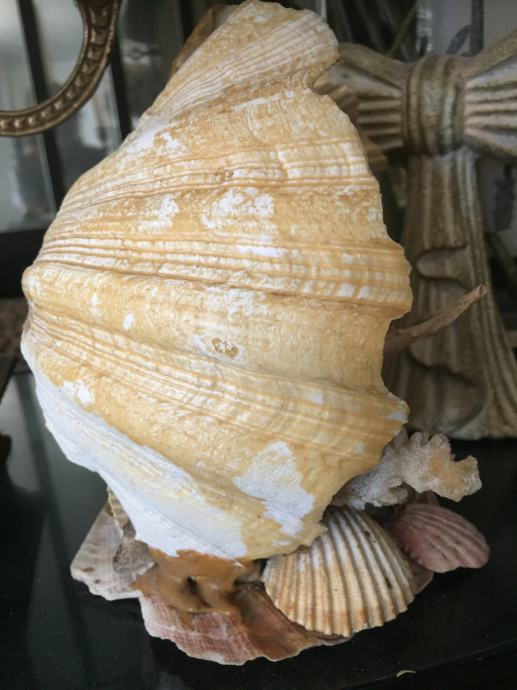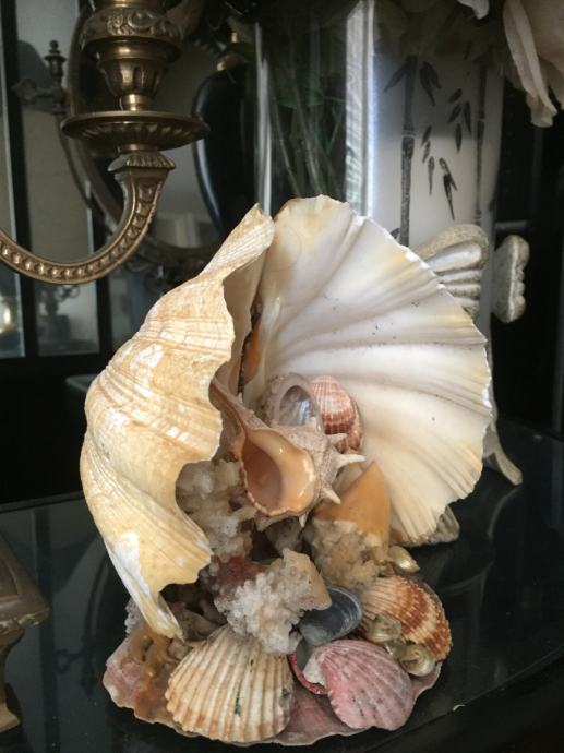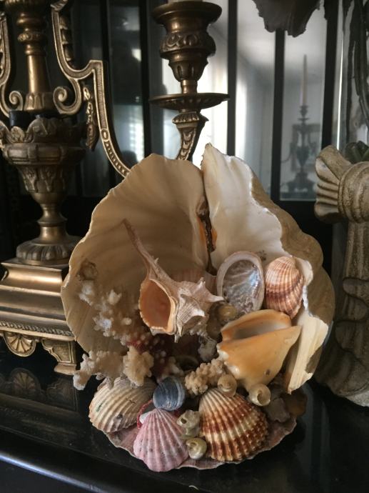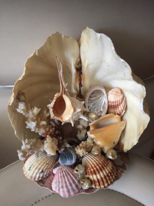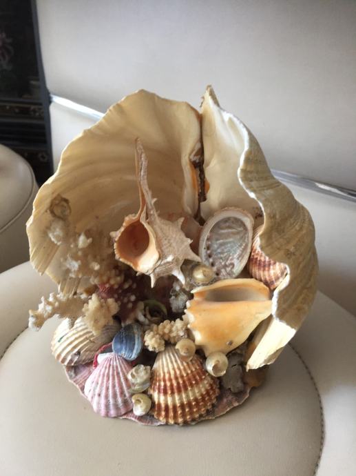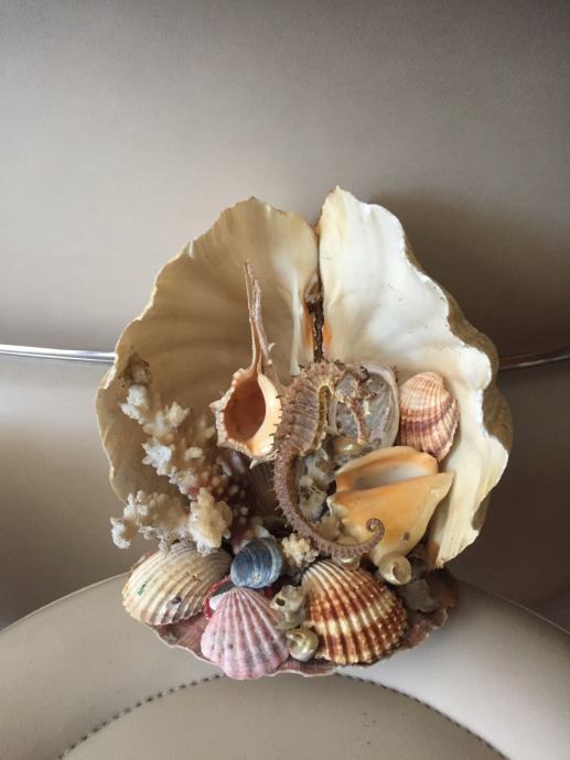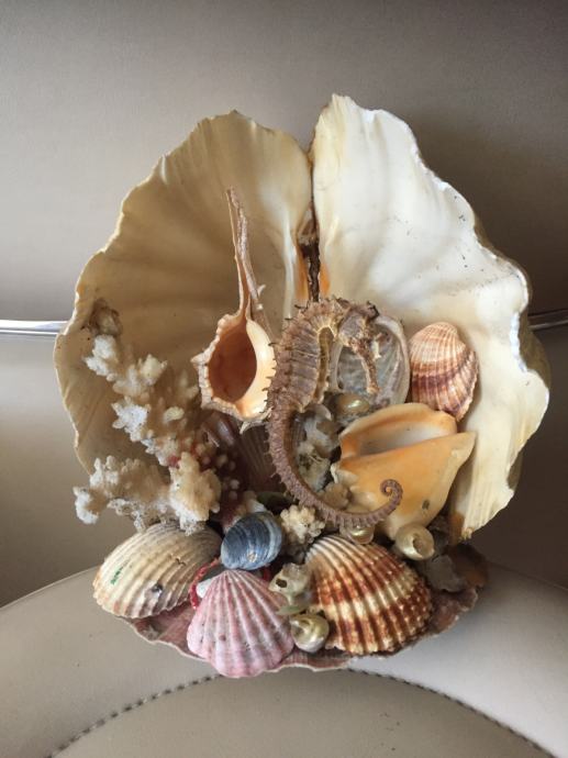 Efektna lepeza školjka sa raznim vrstama školjki i bijelim koraljem..morski konjić zasebno