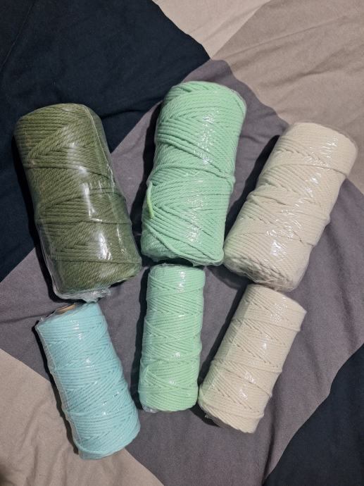Prodajem nove role macrame špage, raznih boja. Špaga je upredena, pogodna za razne macrame projekte i dekoracije. Sve role su nove i nekorištene. Makrame pamučna špaga, 0,3 i 0,5 mm debljine , 0,08 €/m
