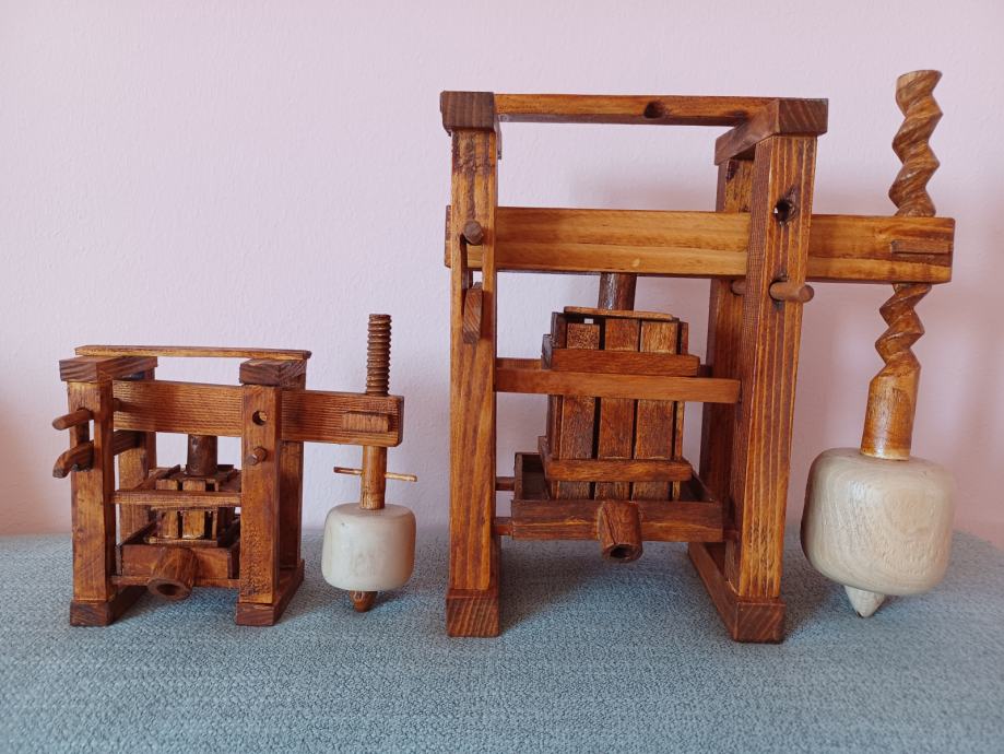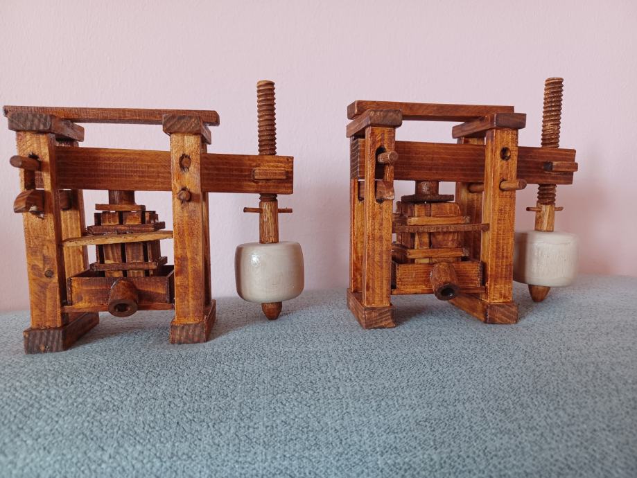 Suvenir drvene preše visine 14 cm, širine 17 cm, dubine 9 cm. Ručni rad