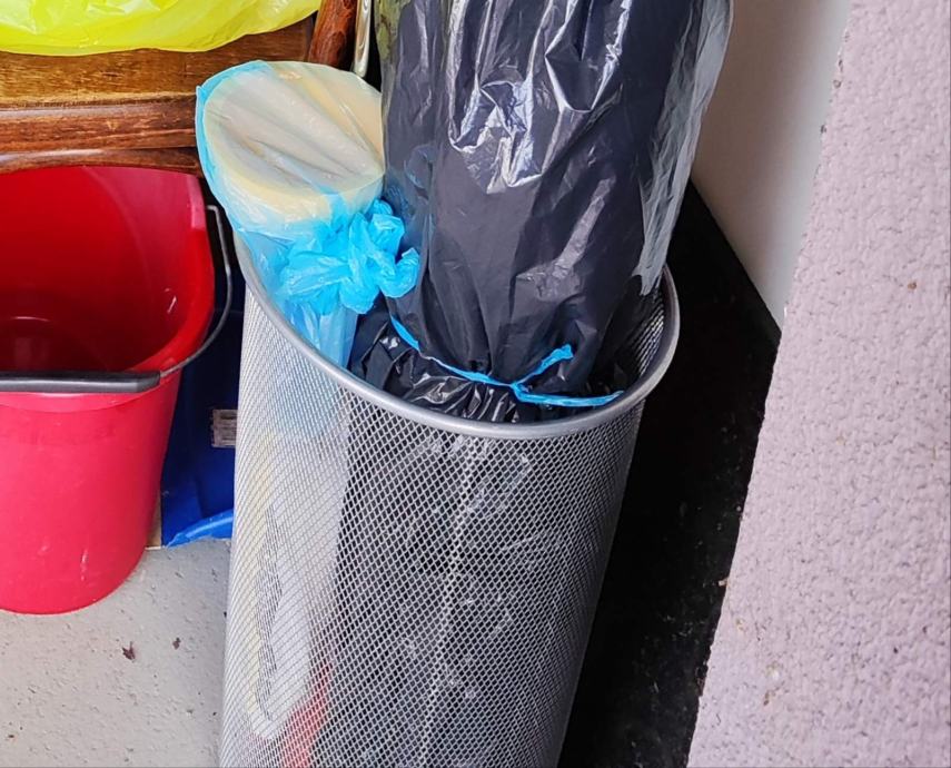 Metalni sivi uredski koš za smeće i visoki lavor crveni za kupaonu