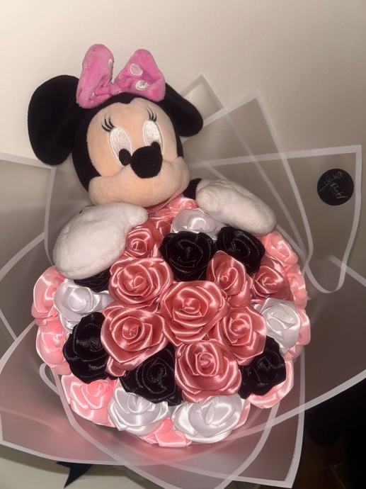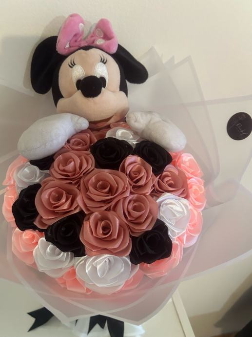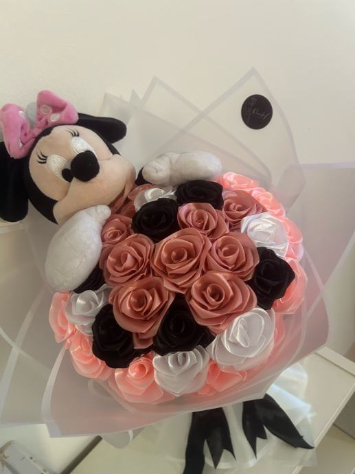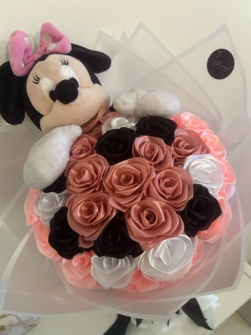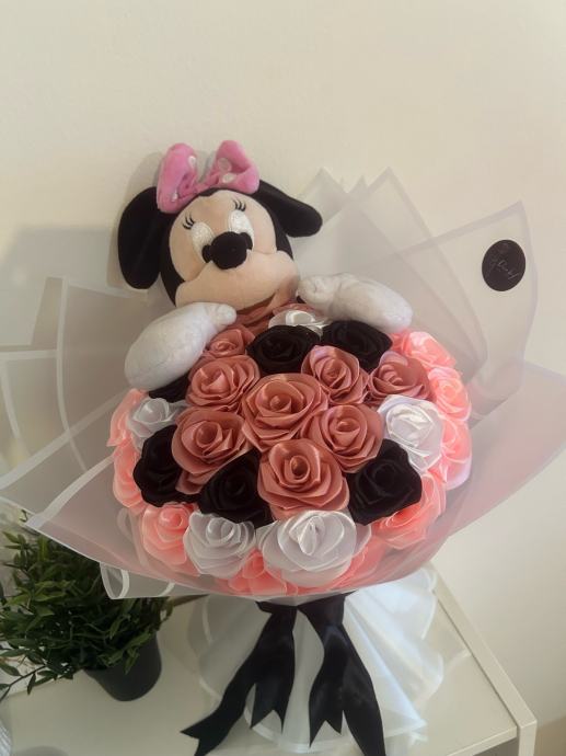 Prodajem ručno rađen luksuzni buket s ružama od satena i minnie mausom
