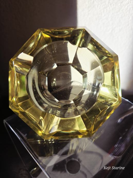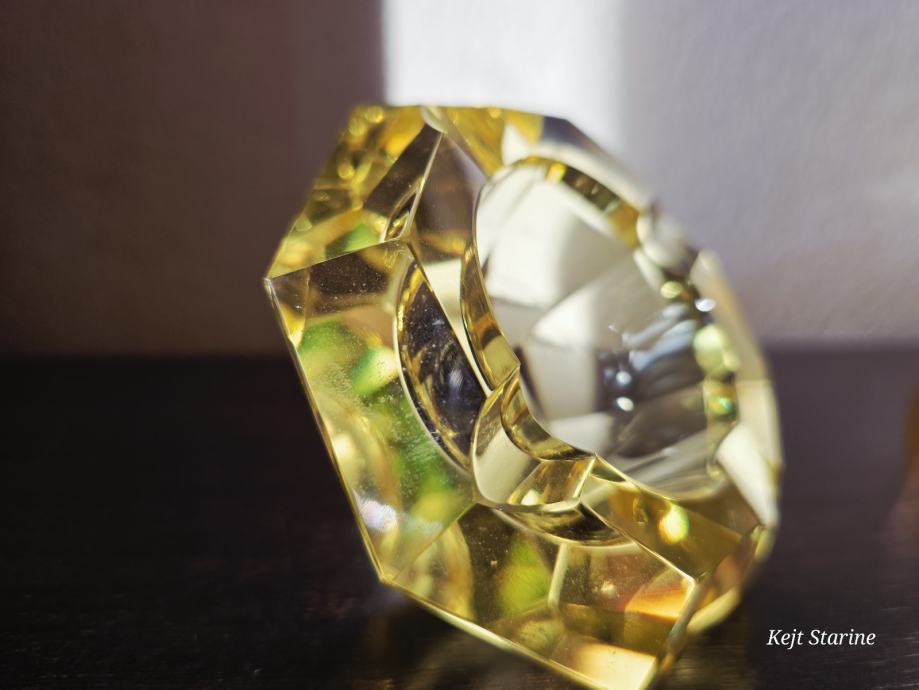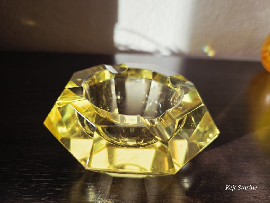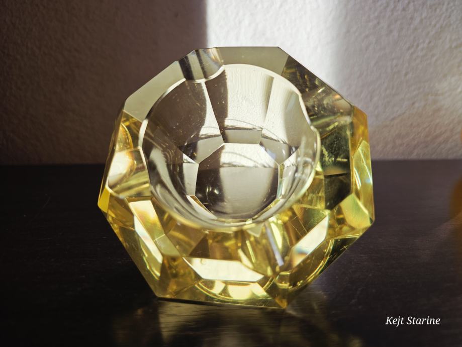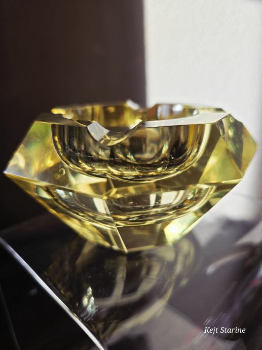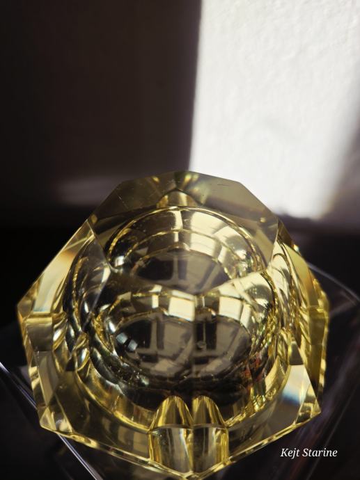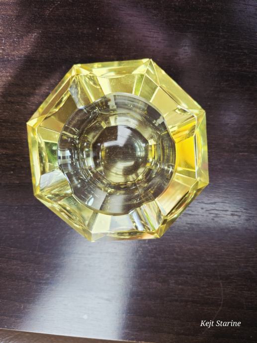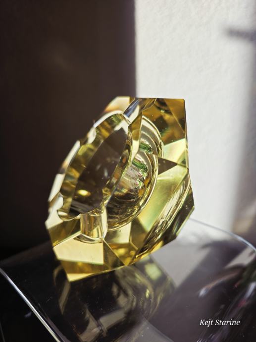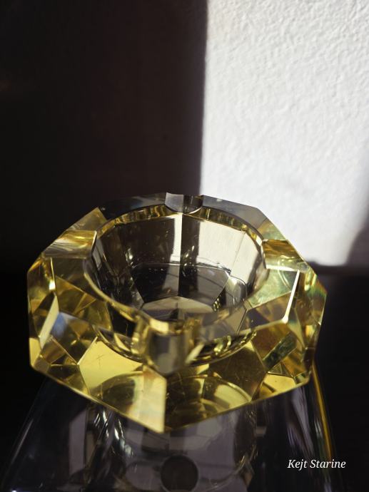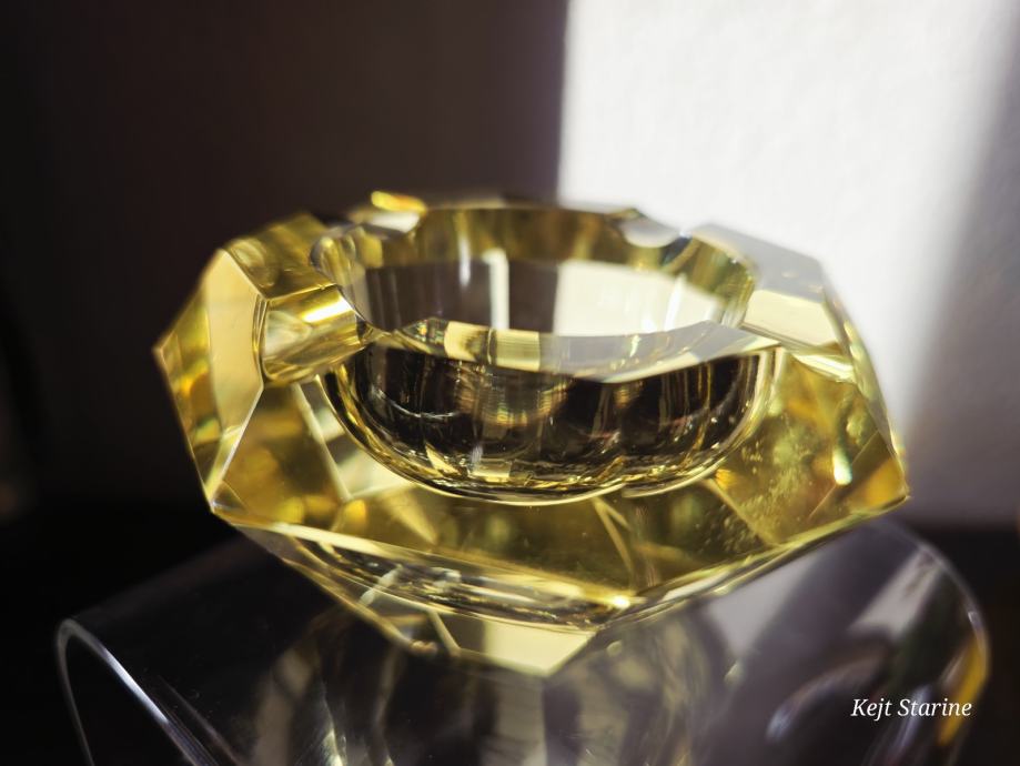 Žuta kristalna pepeljara je Bohemia Moser Crystal (Bohemijski kristal), proizvedena u Čehoslovačkoj (Češka Republika) tijekom 1960-ih, u stilu Art Decoa. Pepeljara je ručno rezana i fasetirana, što kristalu daje karakterističan sjaj.