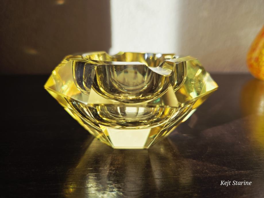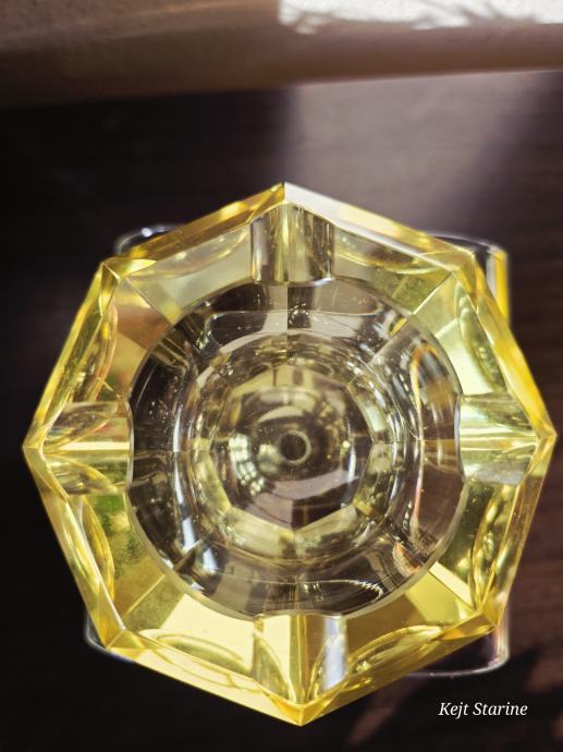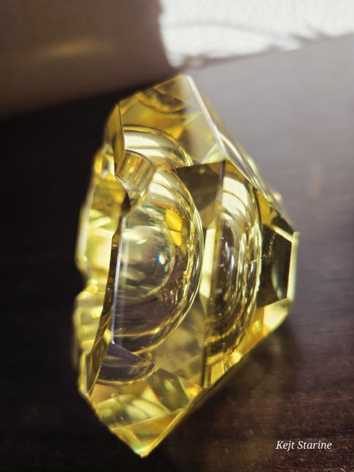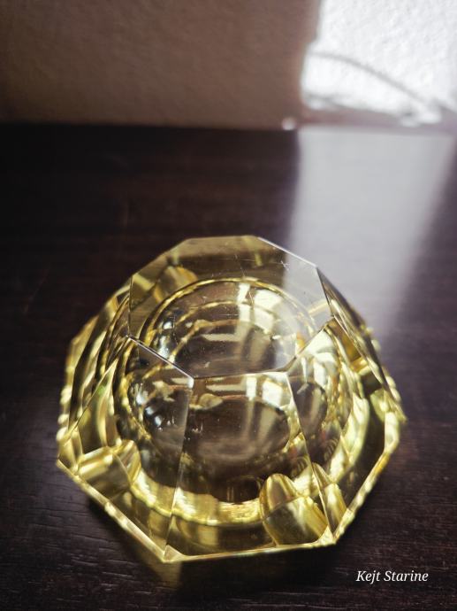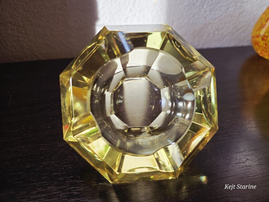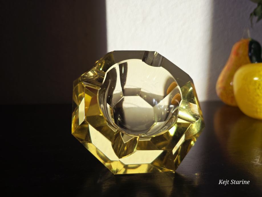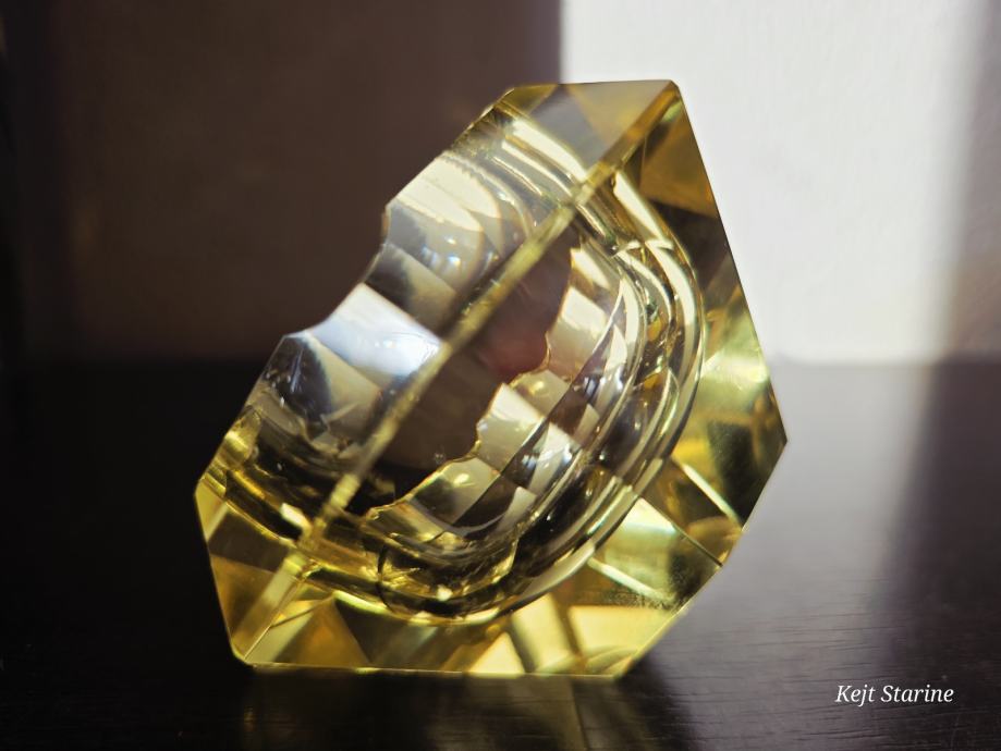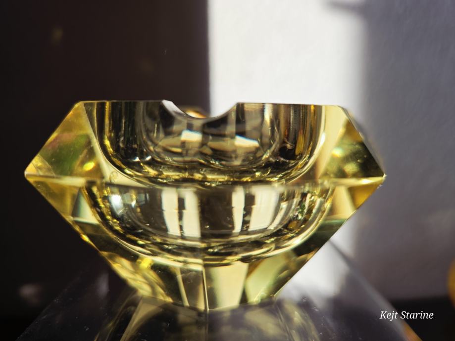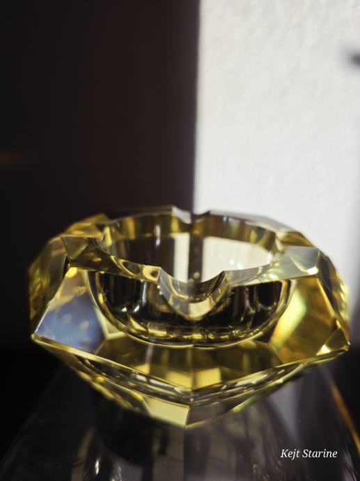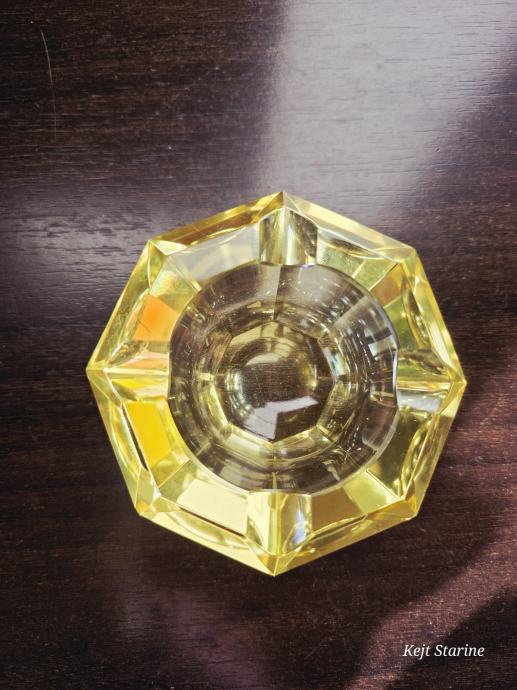 Žuta kristalna pepeljara je Bohemia Moser Crystal (Bohemijski kristal), proizvedena u Čehoslovačkoj (Češka Republika) tijekom 1960-ih, u stilu Art Decoa. Pepeljara je ručno rezana i fasetirana, što kristalu daje karakterističan sjaj.