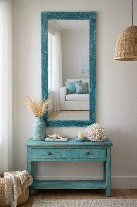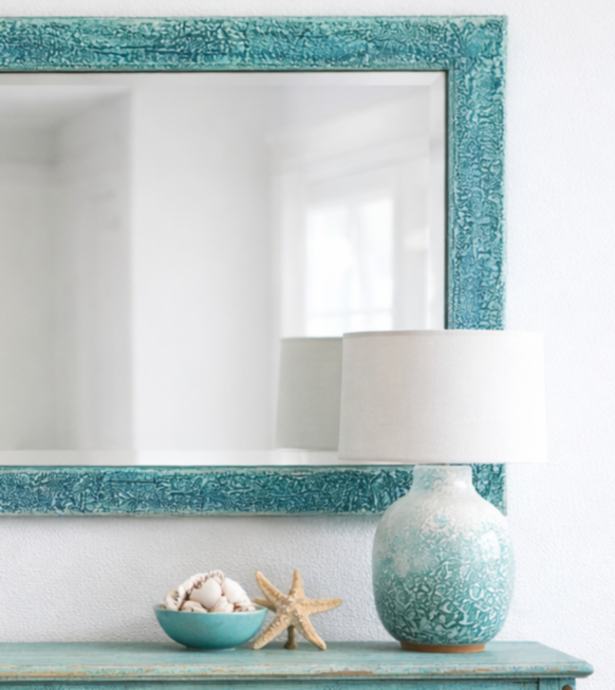 Veliko ogledalo u bojama mora - od tamnotirkizne, plavozelene do bijele. Na okviru su napravljene teksture.