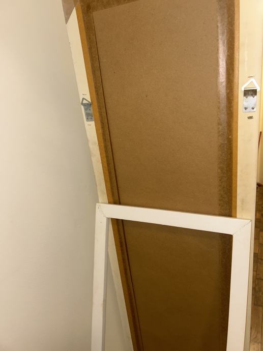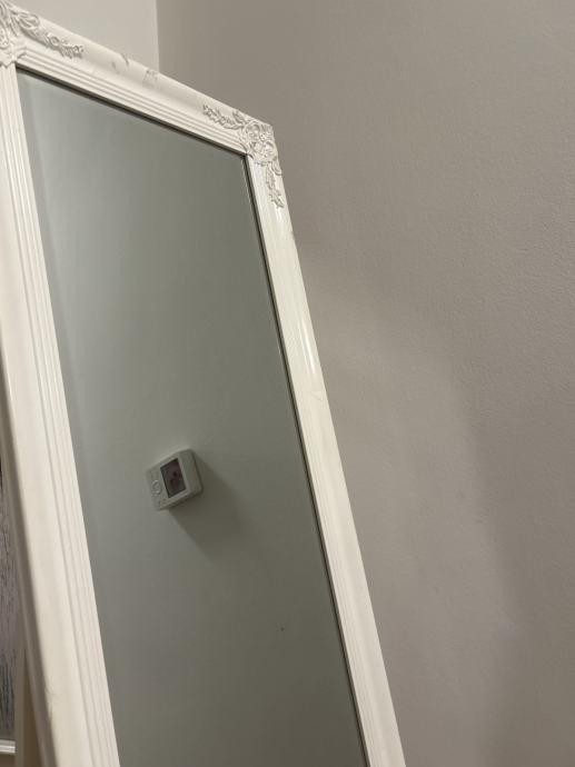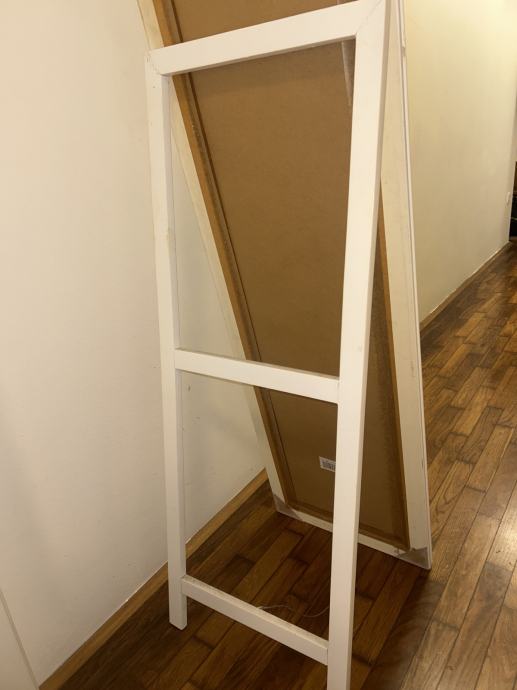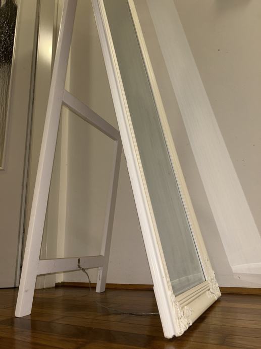 Samostojeće ogledalo u perfektnom stanju, dimenzija oko 2 metara u visinu i pol metara u širinu. Bijeli obrub sa detaljima, može se zakačiti na zid ili stajat sam od sebe.