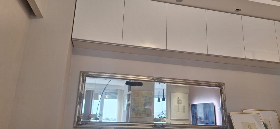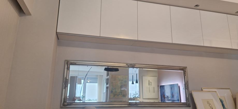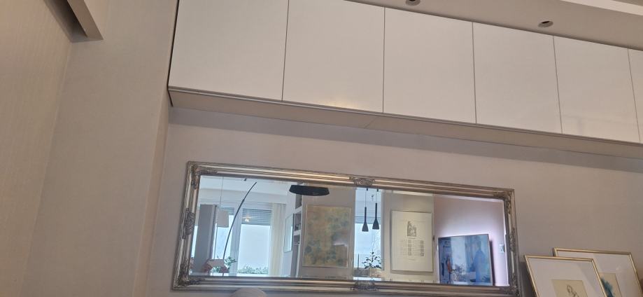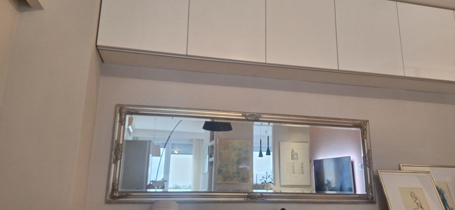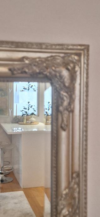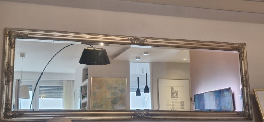 Pravokutno, elegantno ogledalo s fazetom i srebrenim masivnim okvirom. Ogledalo je rabljeno, ali je bez ikakvih ogrebotina, kao novo. Predviđeno je i za vertikalno i za vodoravno vješanje.