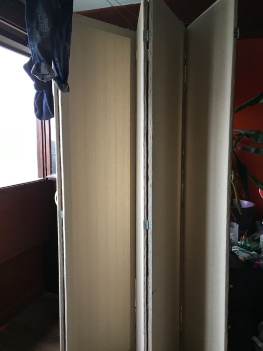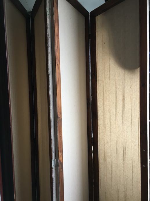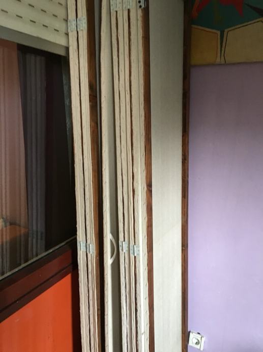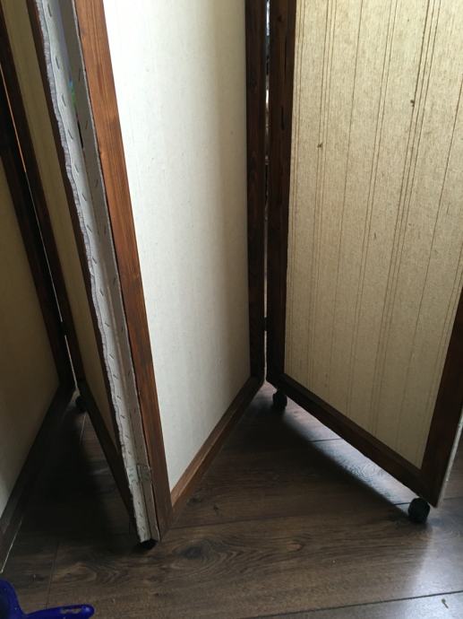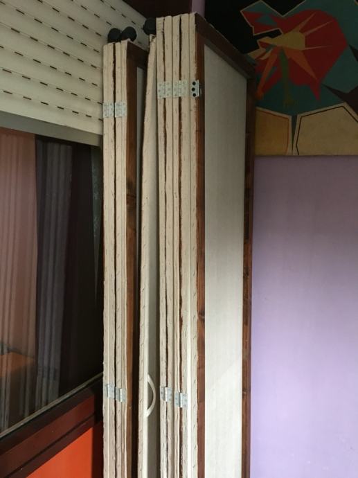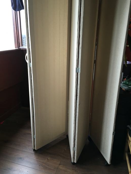Jedan paravana rucno radena,malo je ostecen ,imaju kotacice ,pet krila kad se rastegnu,mogu se zakacit za zid,a ne moraju.Idealni za salon ili odvajanje nekog prostora.Visina 2.20-Širina kad se rastegne 2.5 m-svako krilo pola metra.Kad je skupljeno 12 cm debelo.Cijena 400 kn.0958416685
