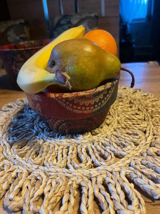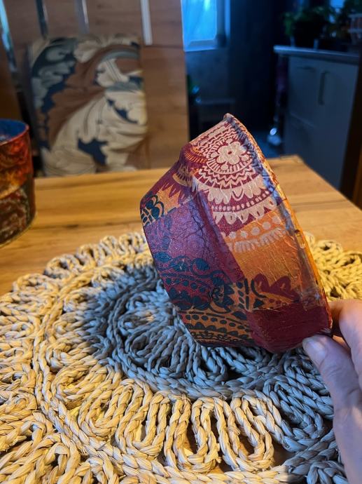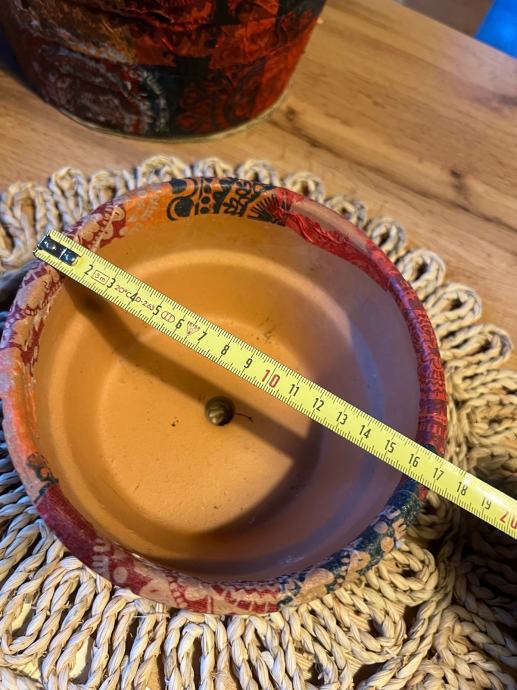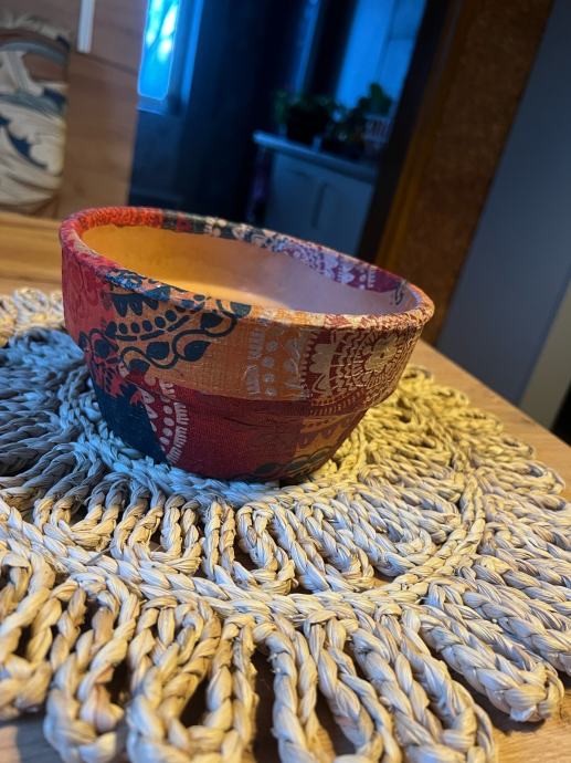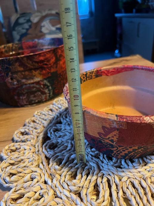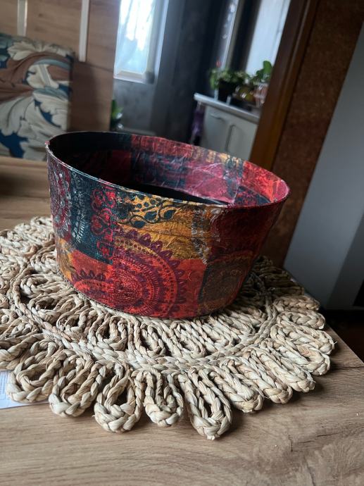 Prodajem set od dvije dekorativne posude, nova i nekorištena. Radi se o ručno ukrašenim posudama s bogatim ornamentalnim uzorkom u toplim tonovima crvene, narančaste, zlatne i tirkizne boje. Uzorci podsjećaju na tradicionalne etničke motive poput paisleya i cvjetnih detalja.